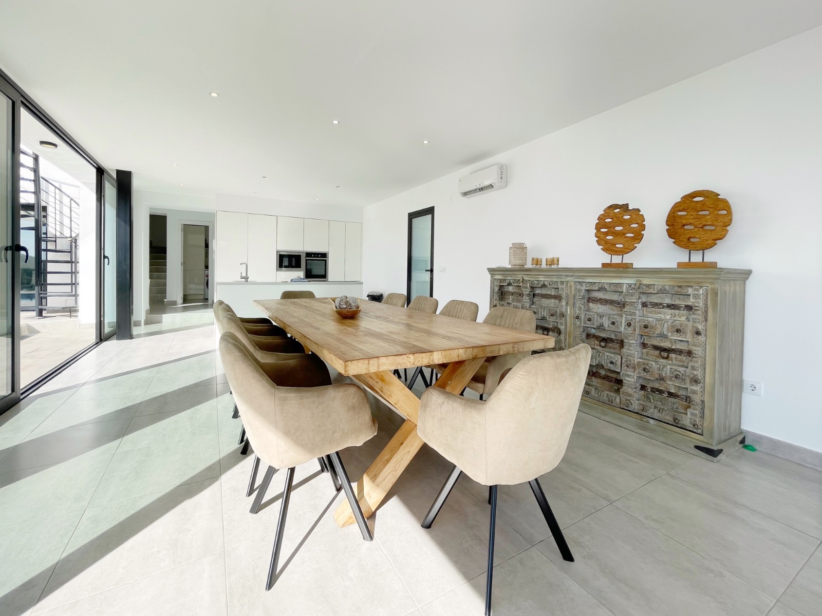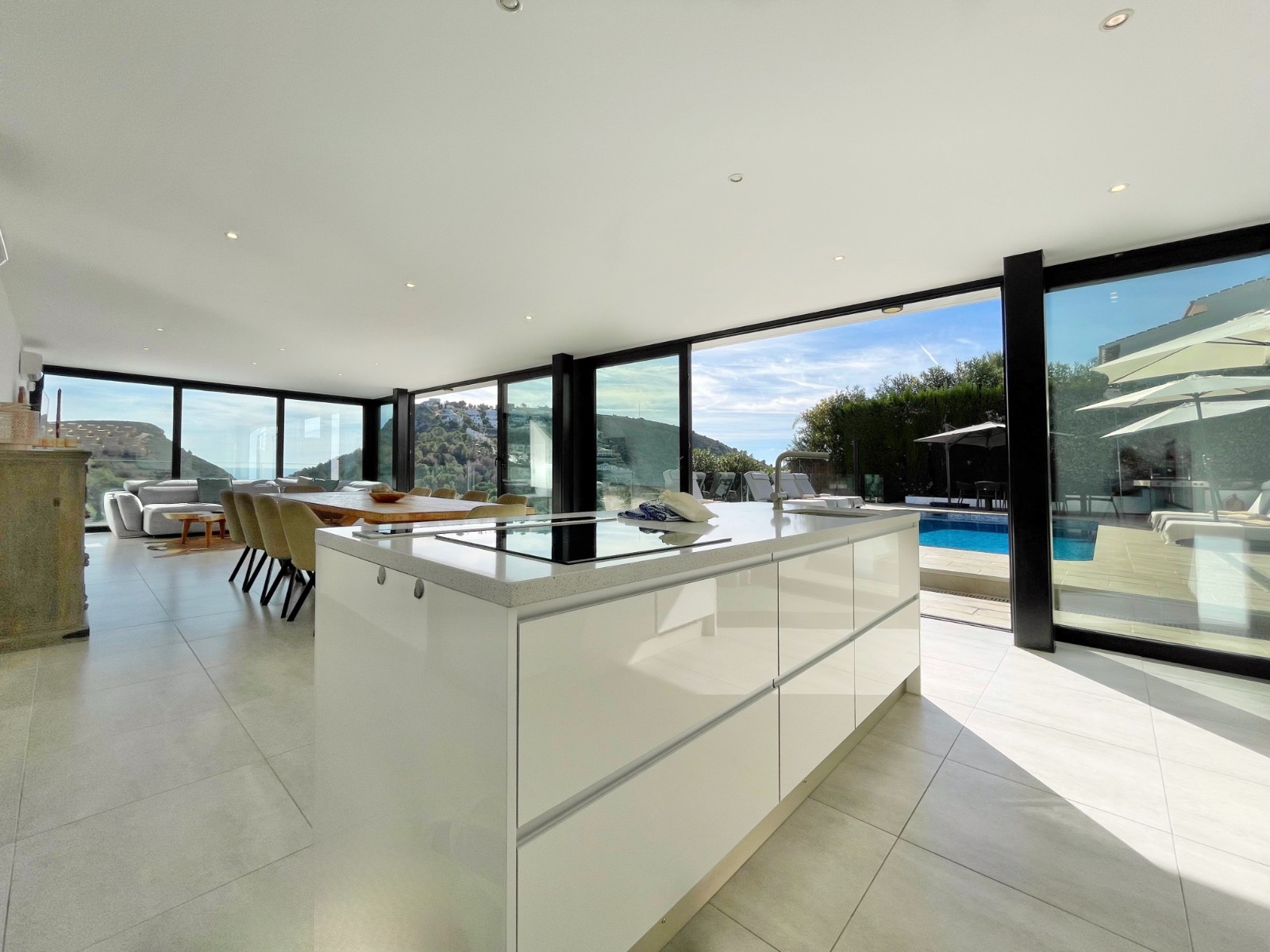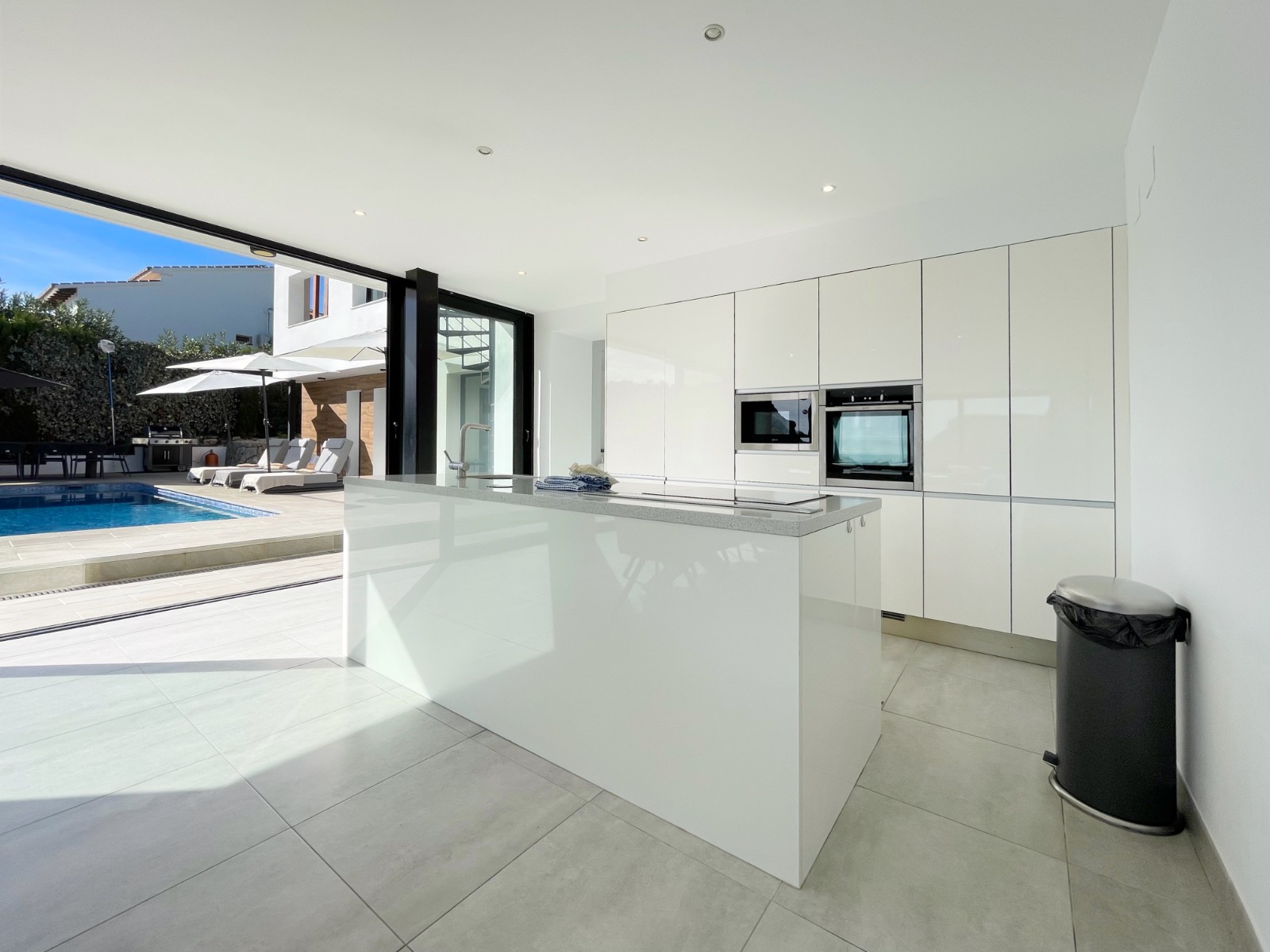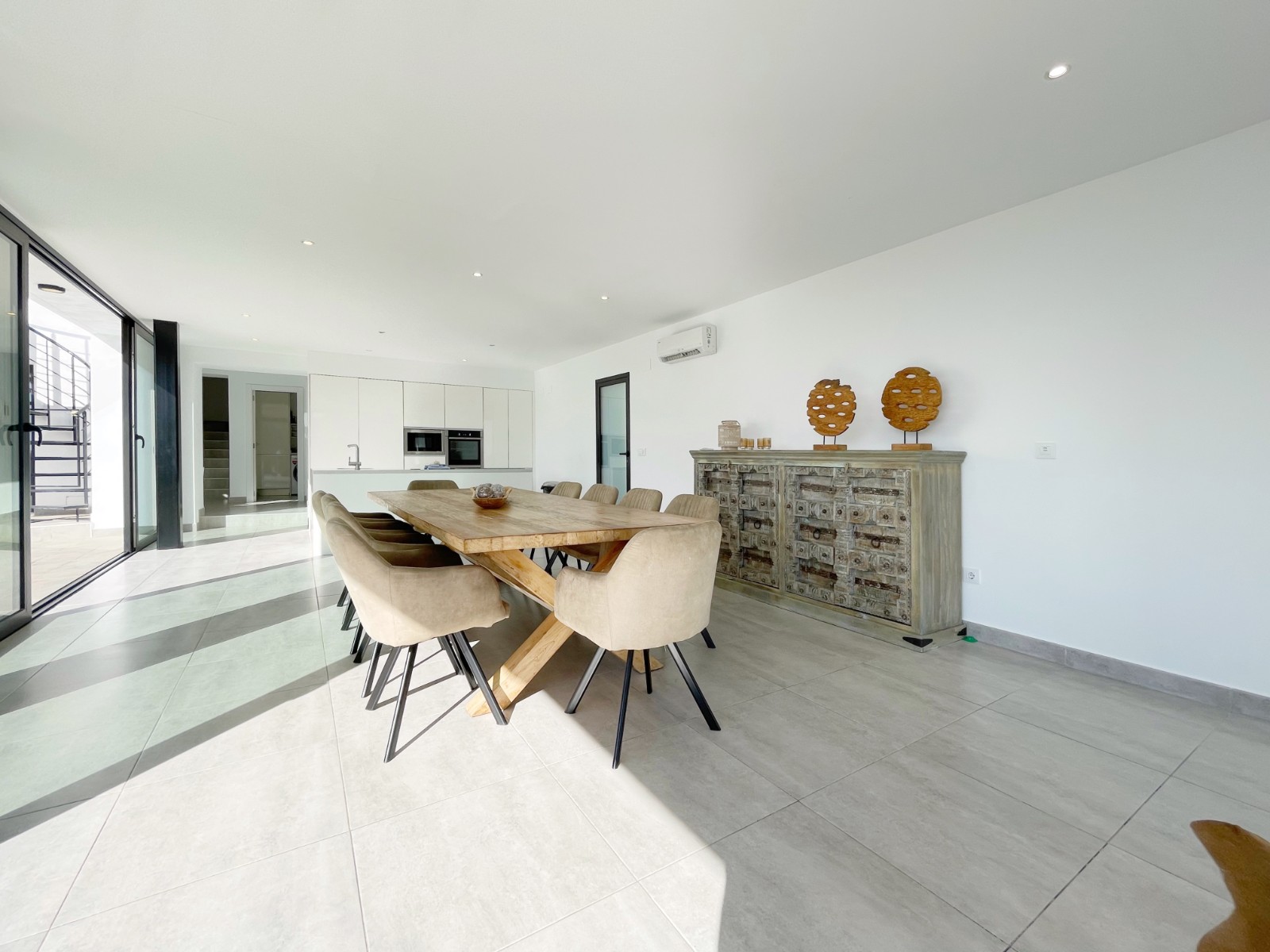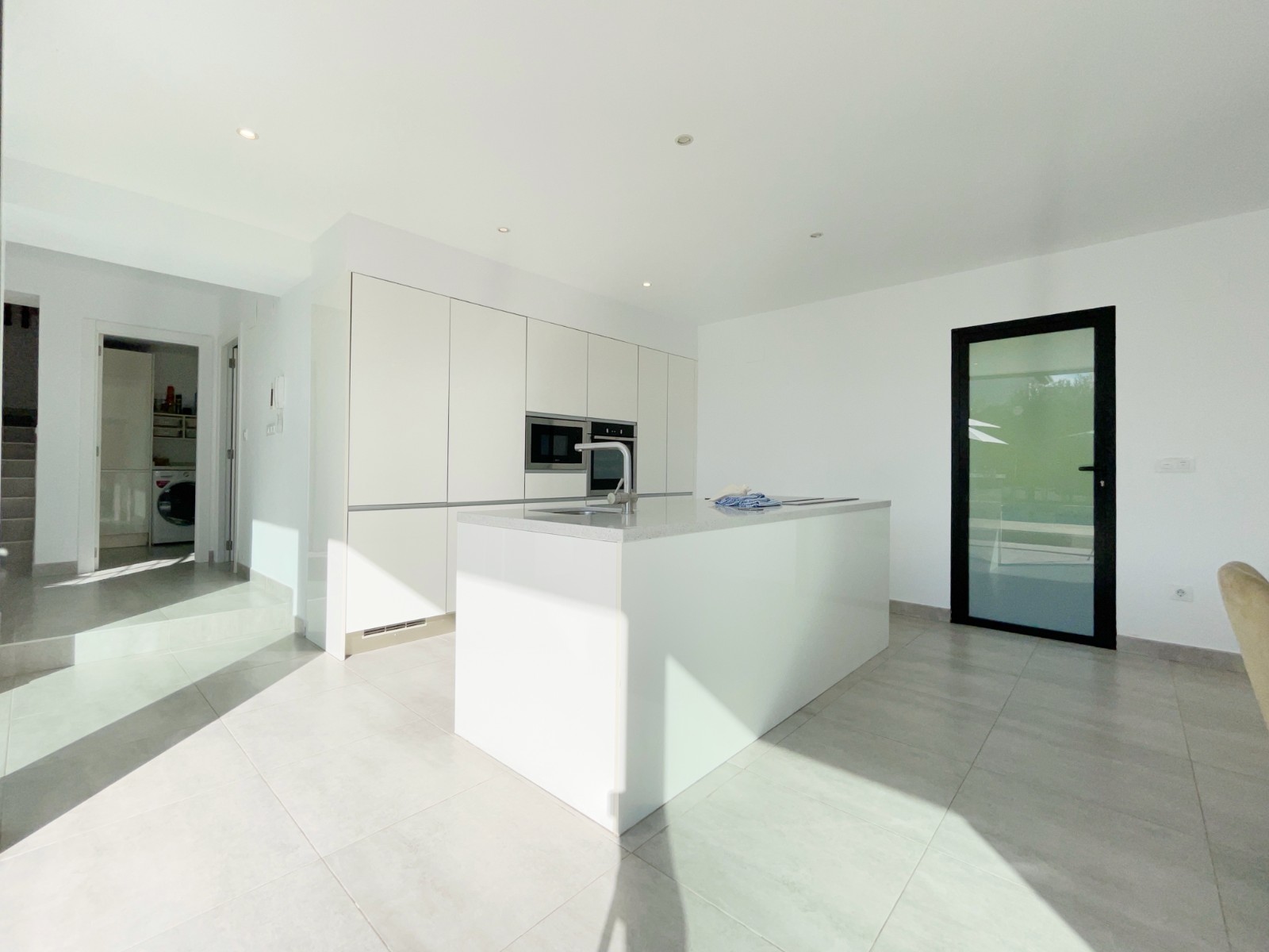 Una escalera interior conduce a la planta baja, donde hay otro amplio dormitorio con baño en suite. El luminoso salón-comedor es el corazón de la casa, con grandes ventanales que conectan el interior con el exterior. La moderna cocina abierta con isla es práctica y está completamente equipada. En esta planta también hay un lavadero independiente, un cuarto de baño adicional y una sala multifuncional que puede utilizarse como sala de descanso, despacho, etc.