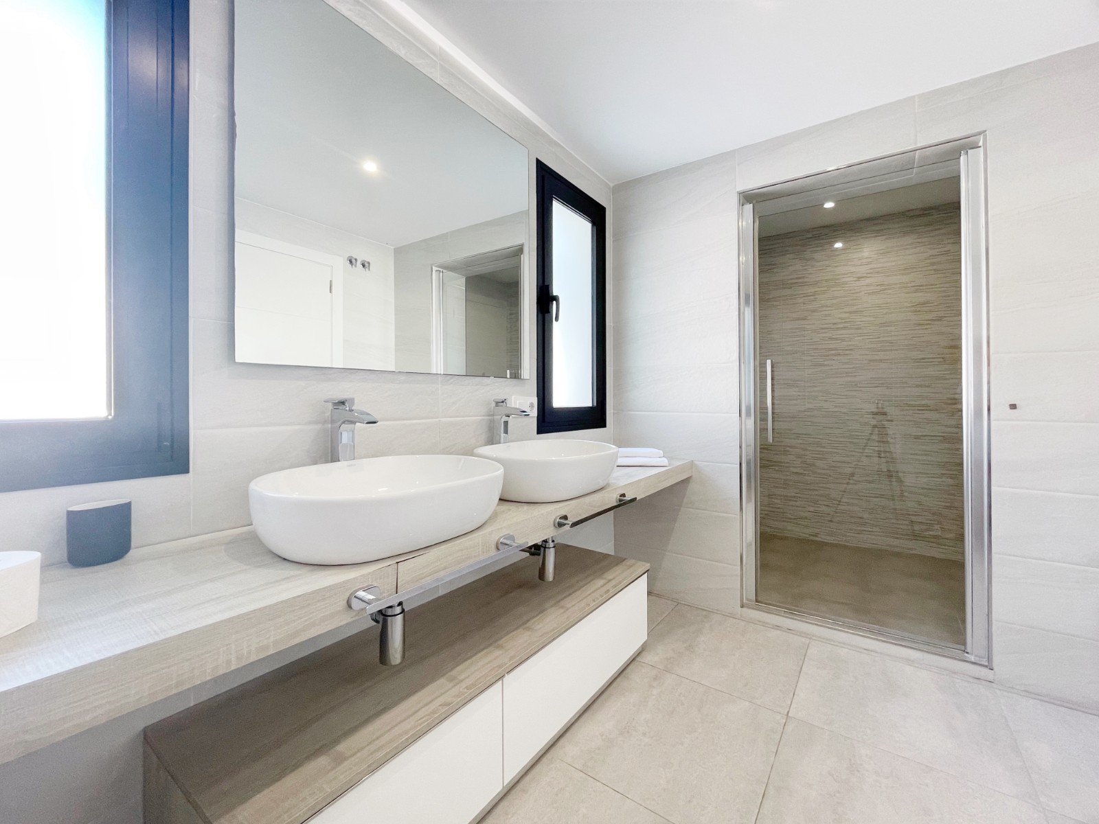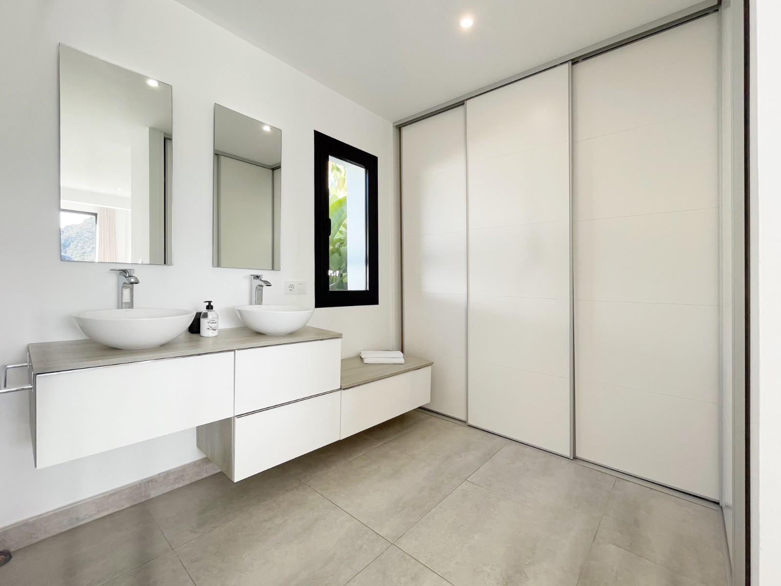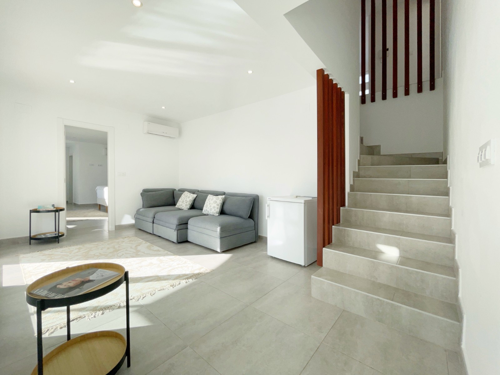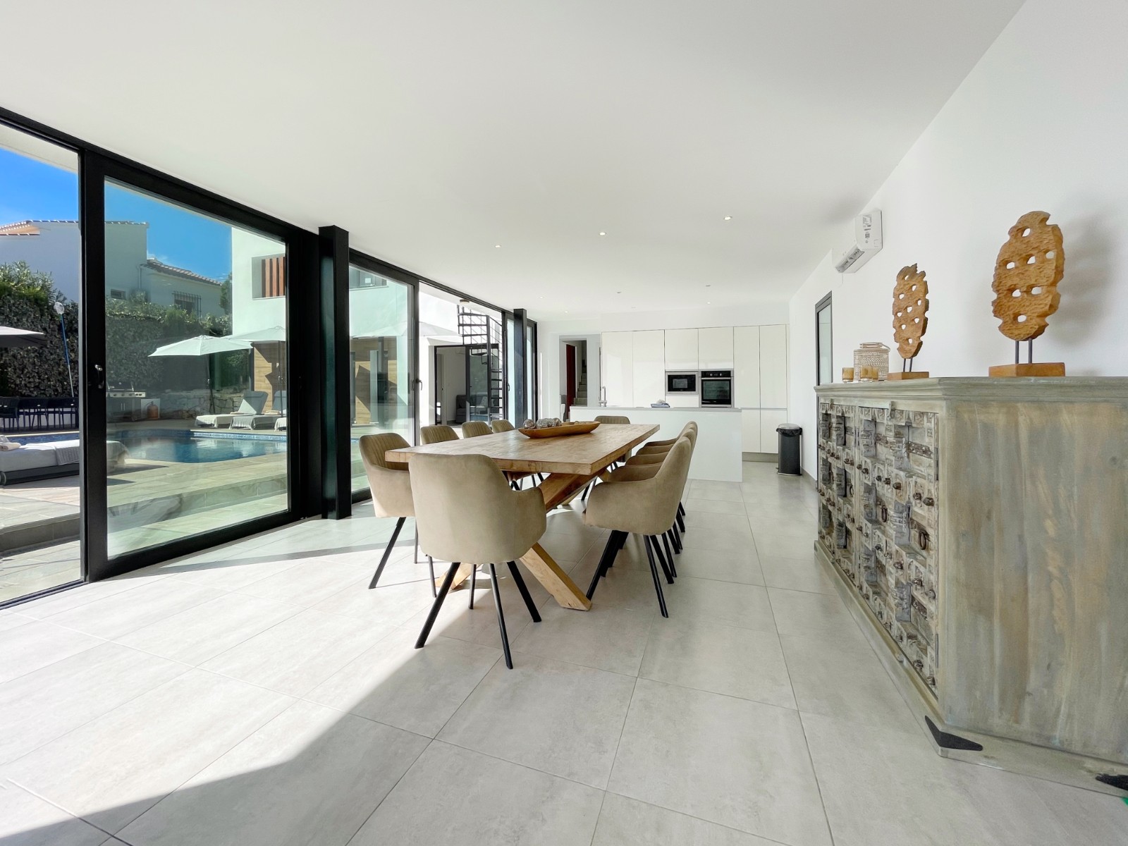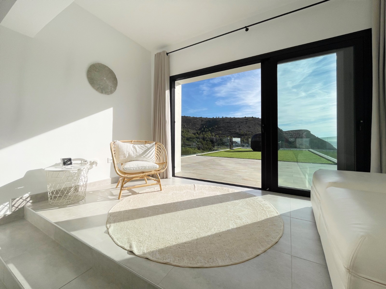 Una escalera interior conduce a la planta baja, donde hay otro amplio dormitorio con baño en suite. El luminoso salón-comedor es el corazón de la casa, con grandes ventanales que conectan el interior con el exterior. La moderna cocina abierta con isla es práctica y está completamente equipada. En esta planta también hay un lavadero independiente, un cuarto de baño adicional y una sala multifuncional que puede utilizarse como sala de descanso, despacho, etc.