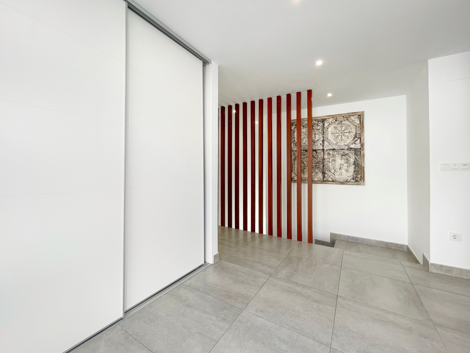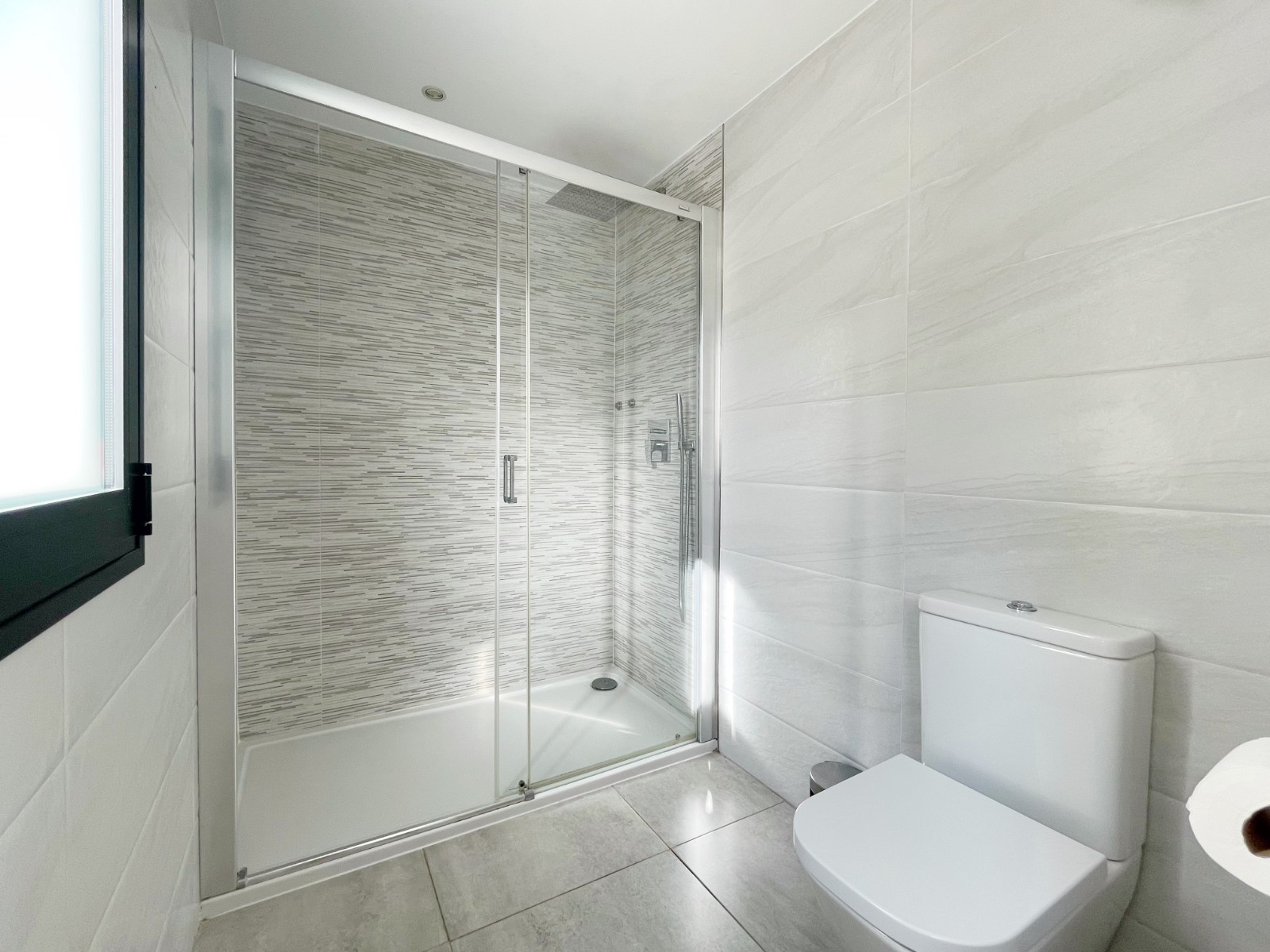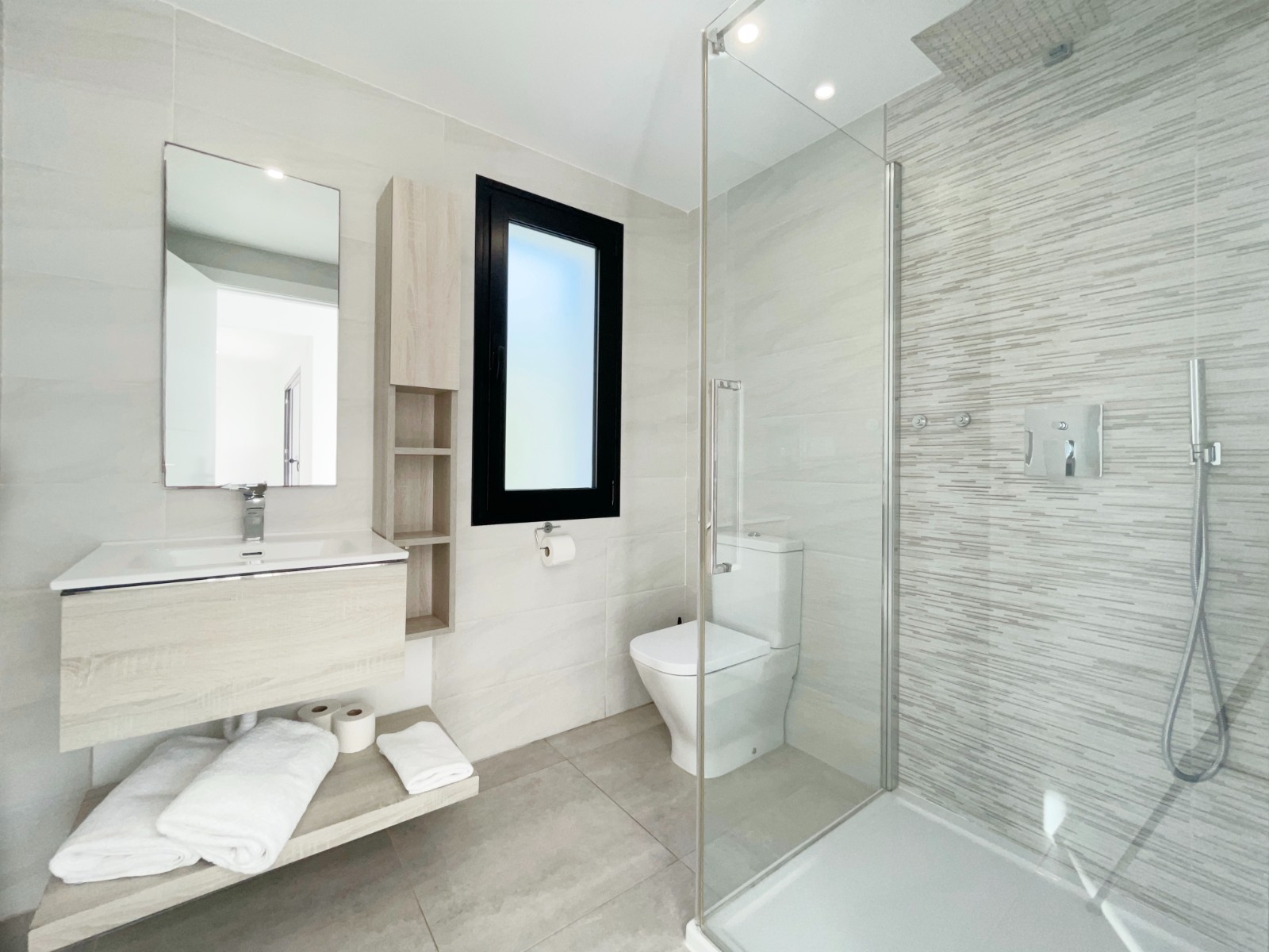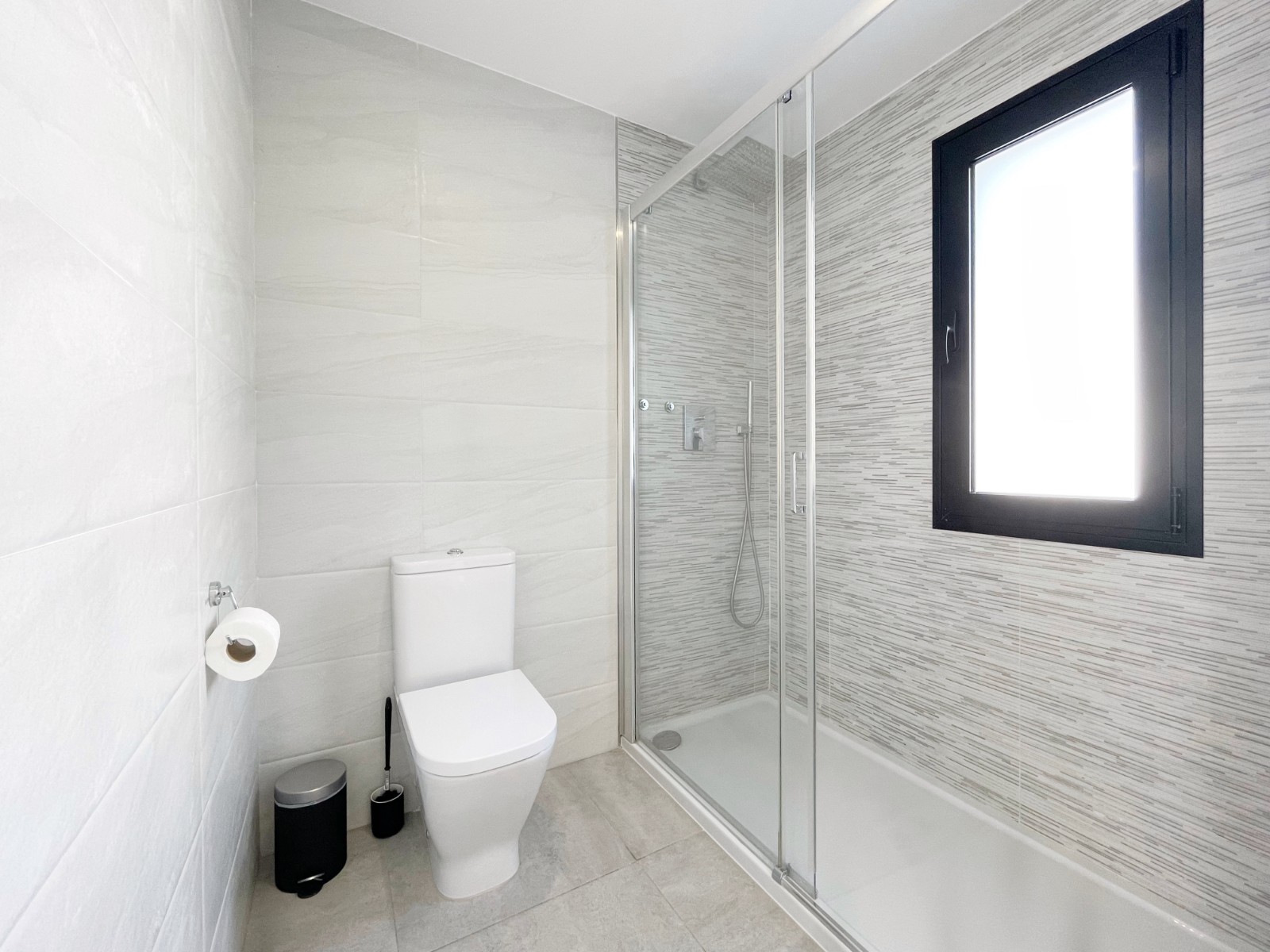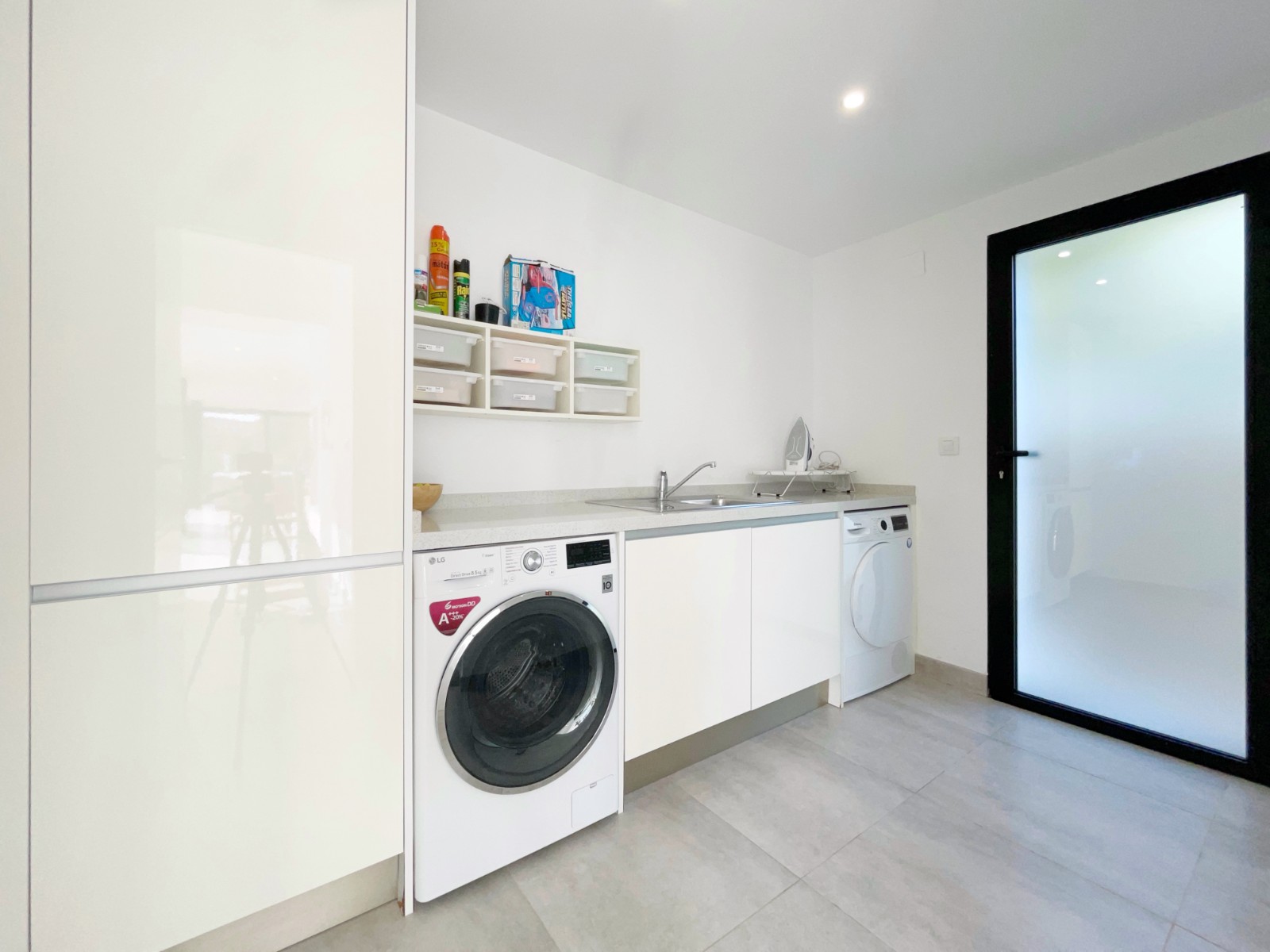 Una escalera interior conduce a la planta baja, donde hay otro amplio dormitorio con baño en suite. El luminoso salón-comedor es el corazón de la casa, con grandes ventanales que conectan el interior con el exterior. La moderna cocina abierta con isla es práctica y está completamente equipada. En esta planta también hay un lavadero independiente, un cuarto de baño adicional y una sala multifuncional que puede utilizarse como sala de descanso, despacho, etc.