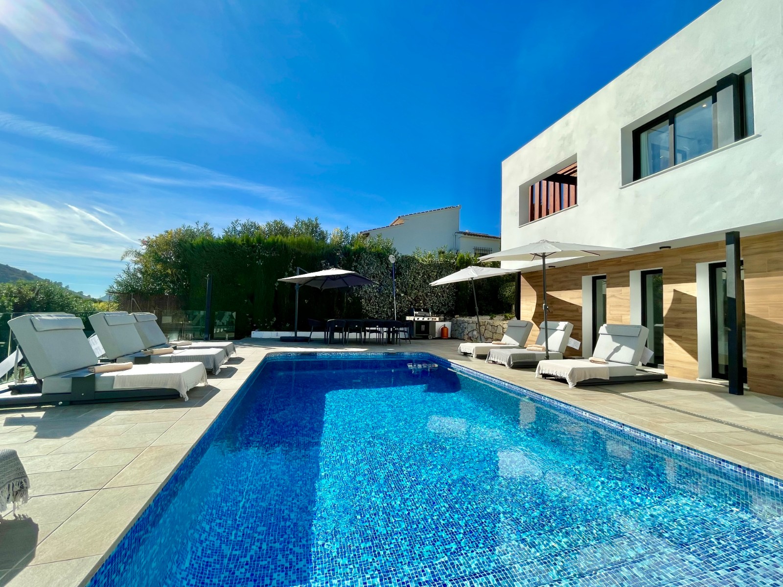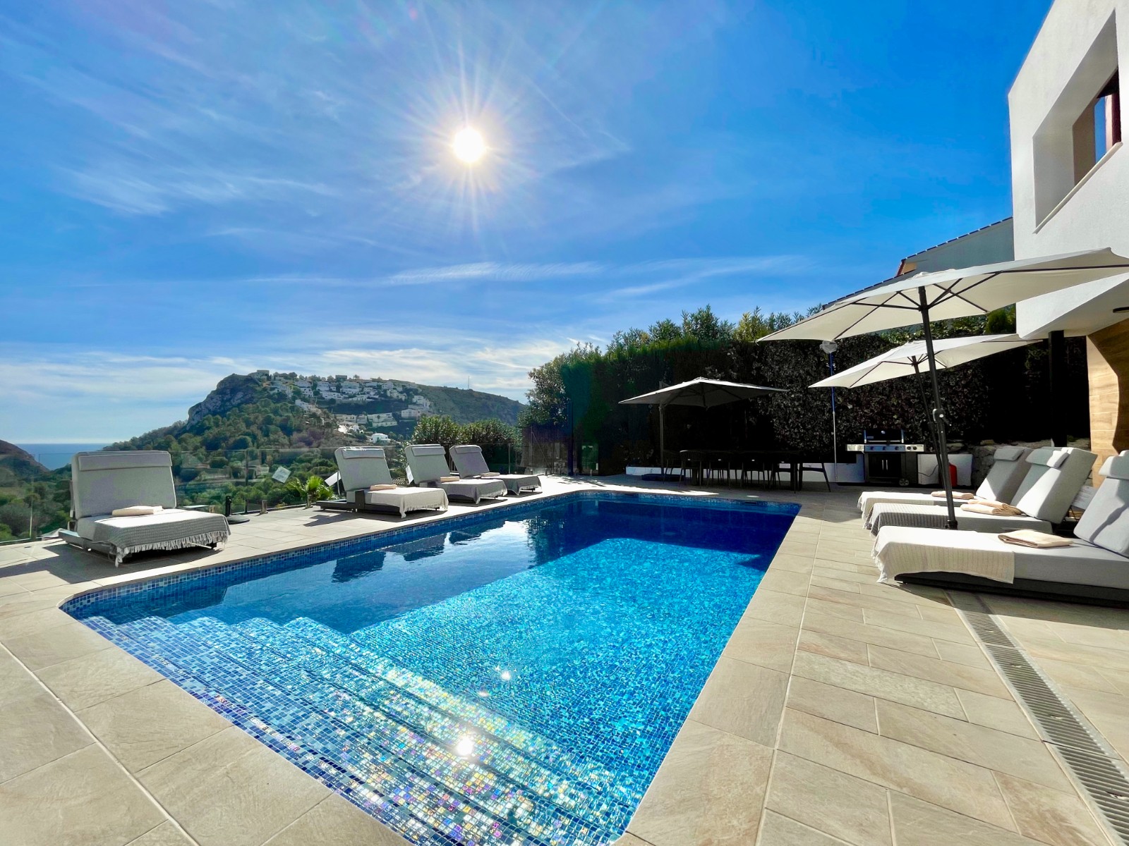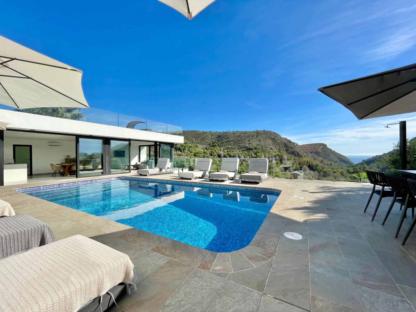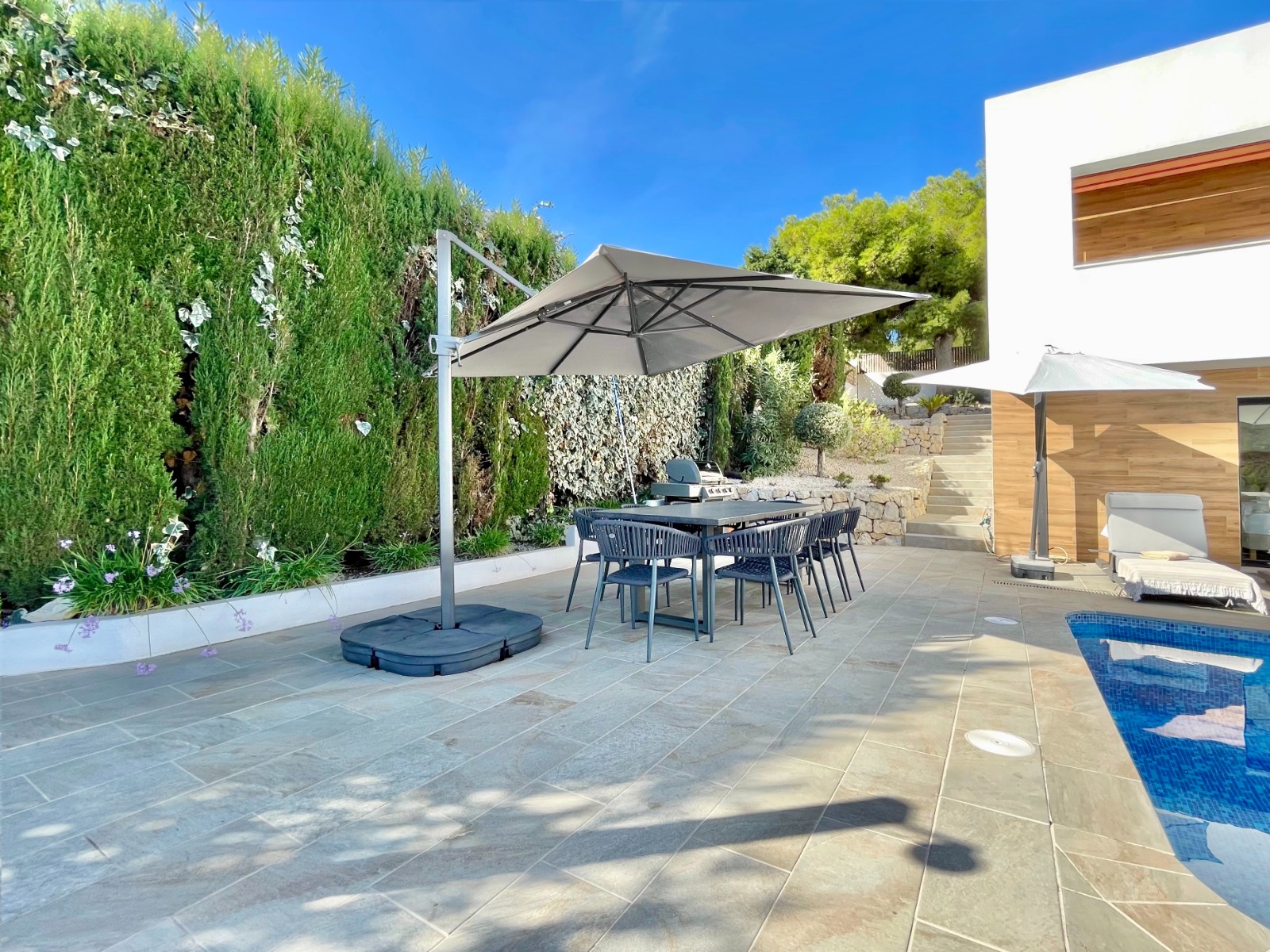 Una amplia terraza soleada con piscina privada ofrece el lugar perfecto para relajarse y disfrutar del maravilloso clima de la Costa Blanca. La piscina cuenta con calefacción y una ducha exterior, para que pueda nadar cómodamente durante todo el año. También hay una acogedora zona de barbacoa, ideal para cenas de verano con vistas al mar. El jardín está diseñado para facilitar su mantenimiento, lo que le da un aspecto limpio y cuidado. Además, la parcela ofrece suficiente espacio para aparcar y una cochera cerrada.