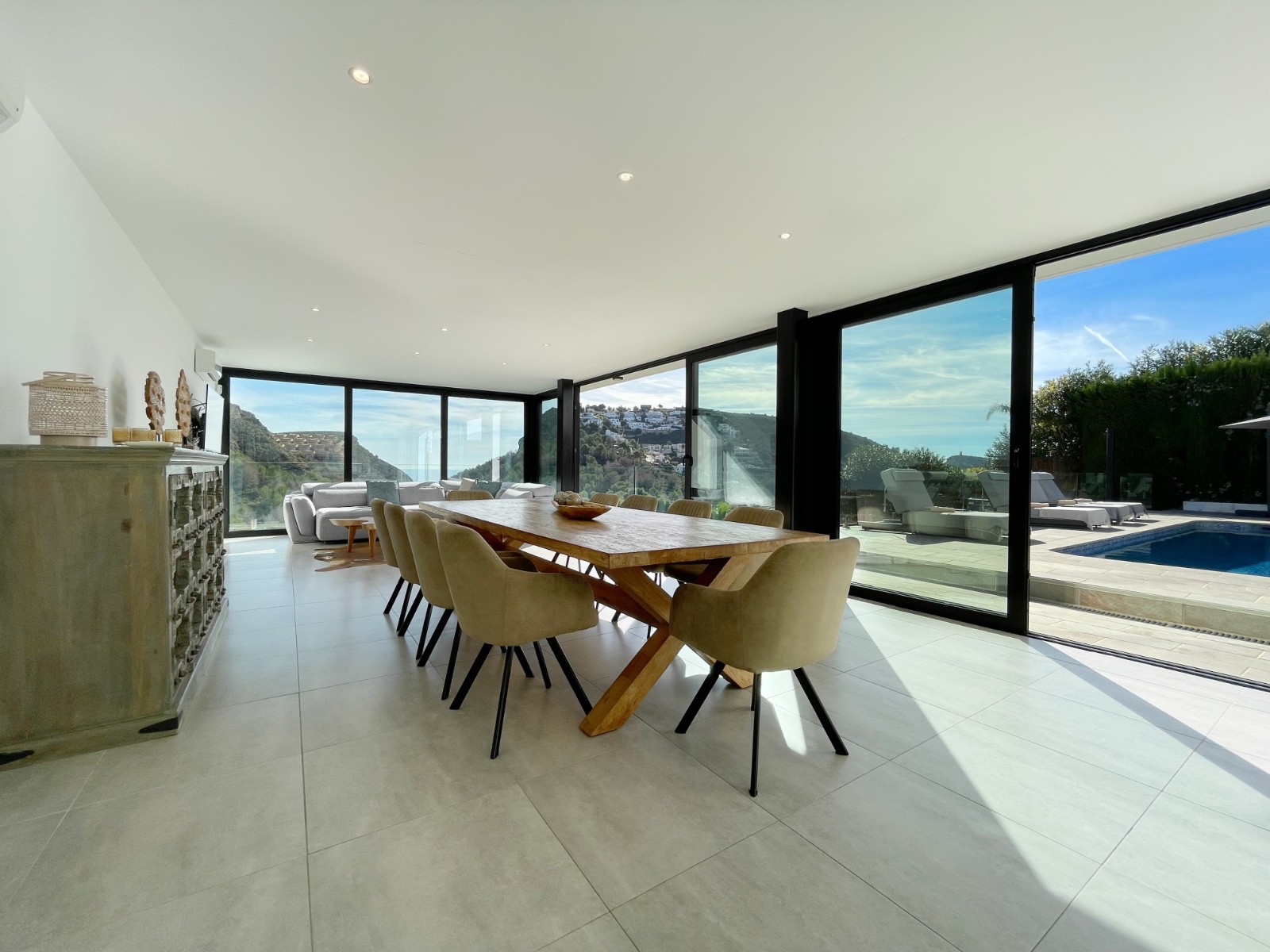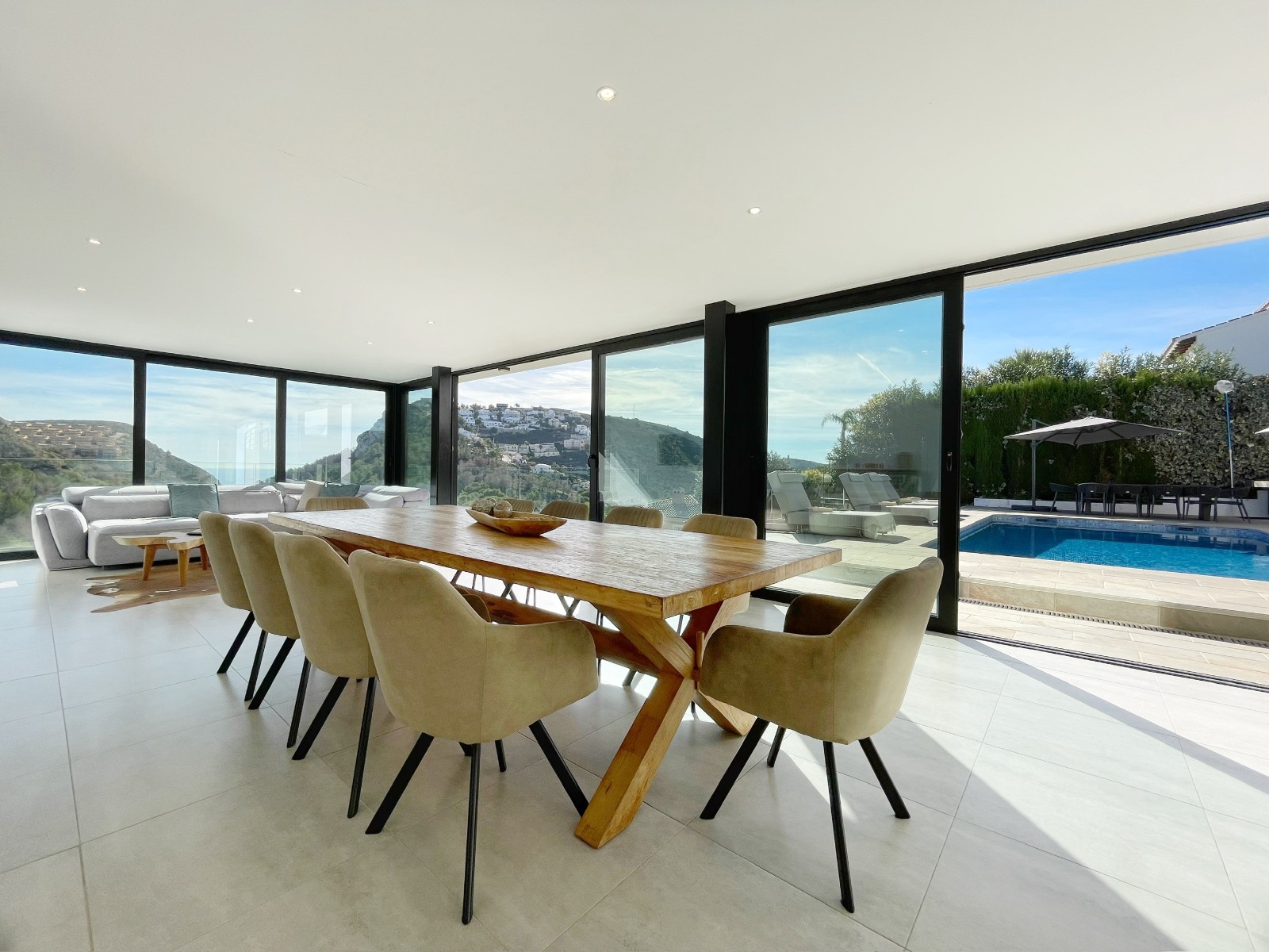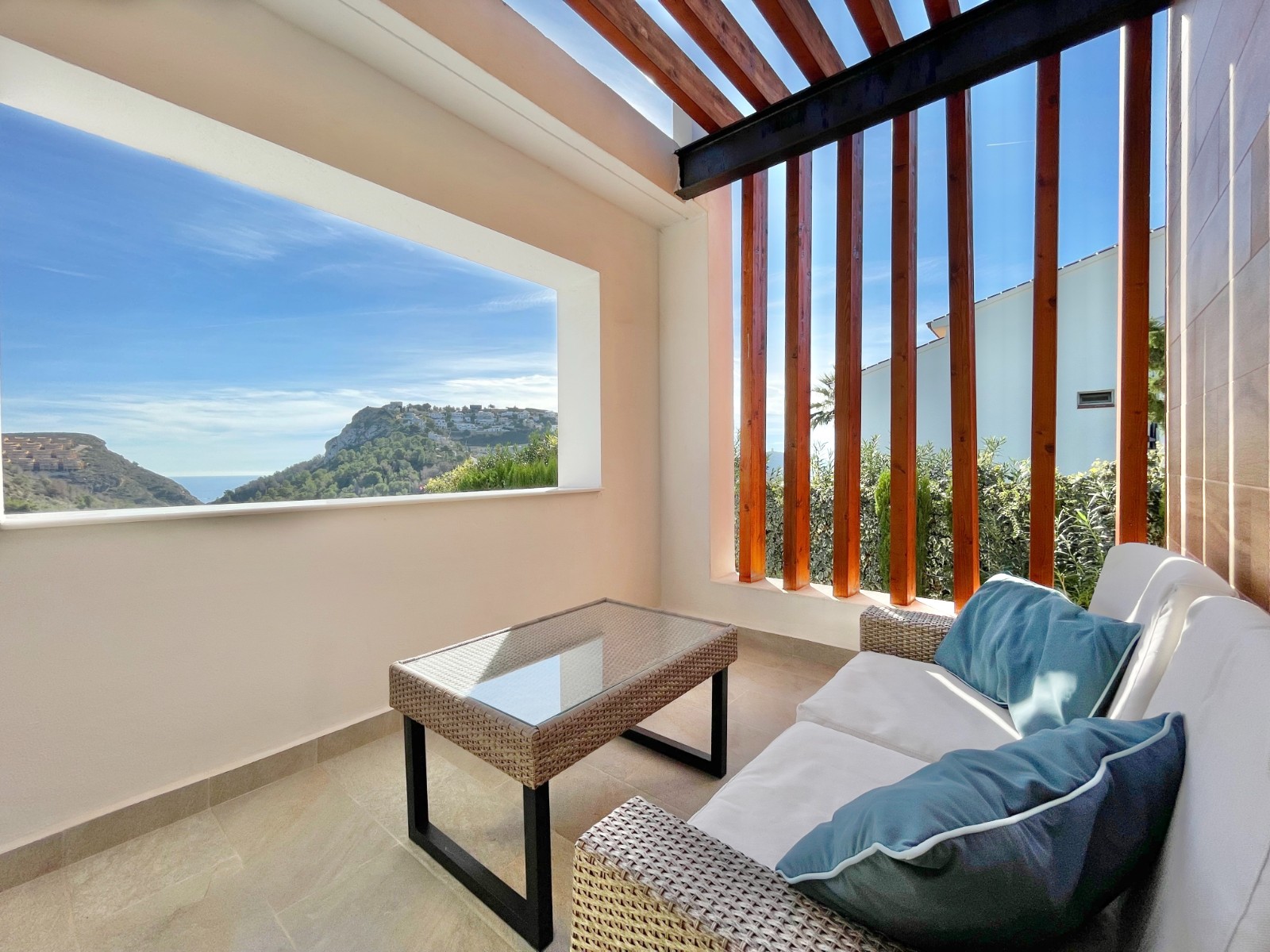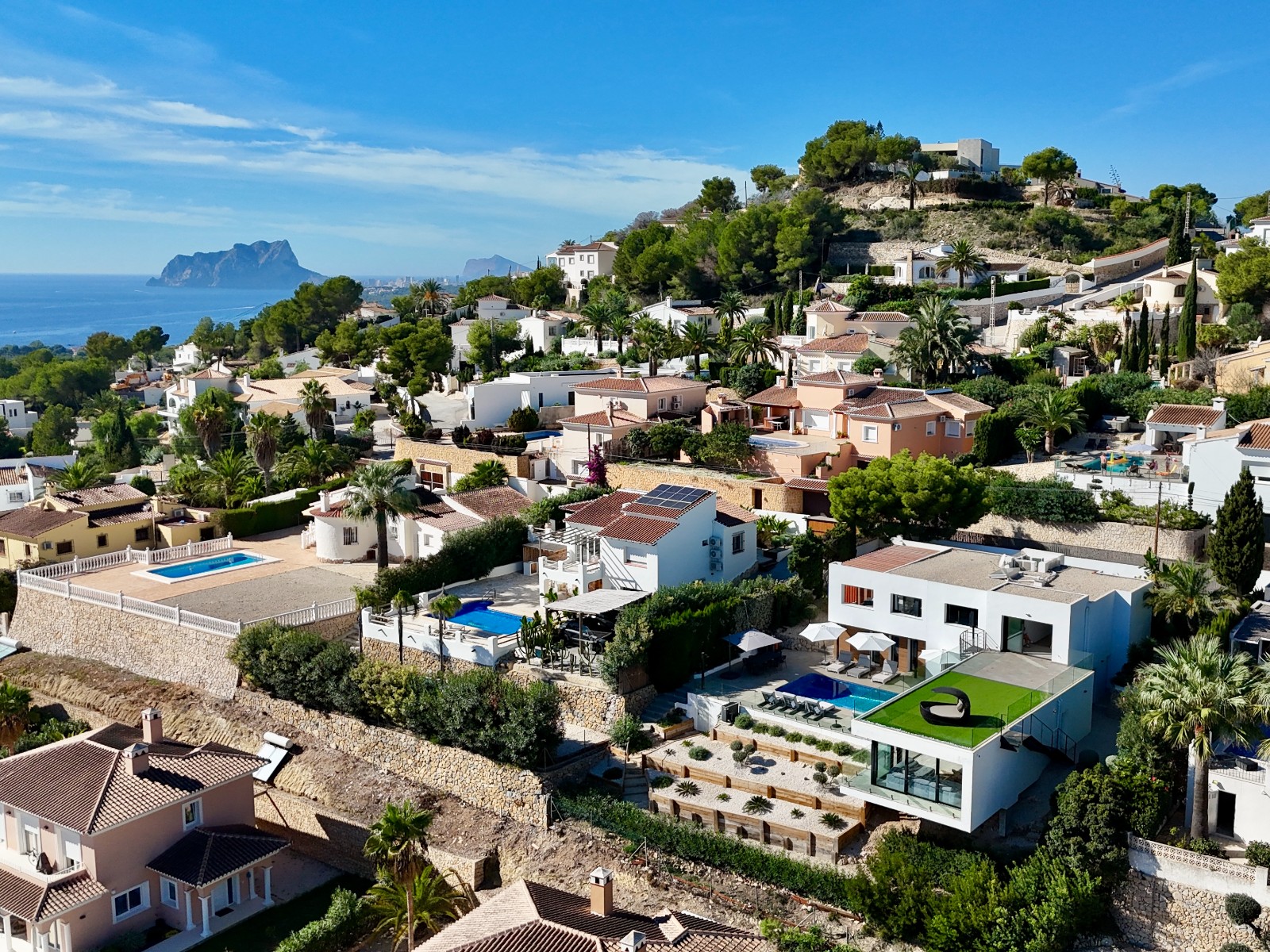 Una amplia terraza soleada con piscina privada ofrece el lugar perfecto para relajarse y disfrutar del maravilloso clima de la Costa Blanca. La piscina cuenta con calefacción y una ducha exterior, para que pueda nadar cómodamente durante todo el año. También hay una acogedora zona de barbacoa, ideal para cenas de verano con vistas al mar. El jardín está diseñado para facilitar su mantenimiento, lo que le da un aspecto limpio y cuidado. Además, la parcela ofrece suficiente espacio para aparcar y una cochera cerrada.