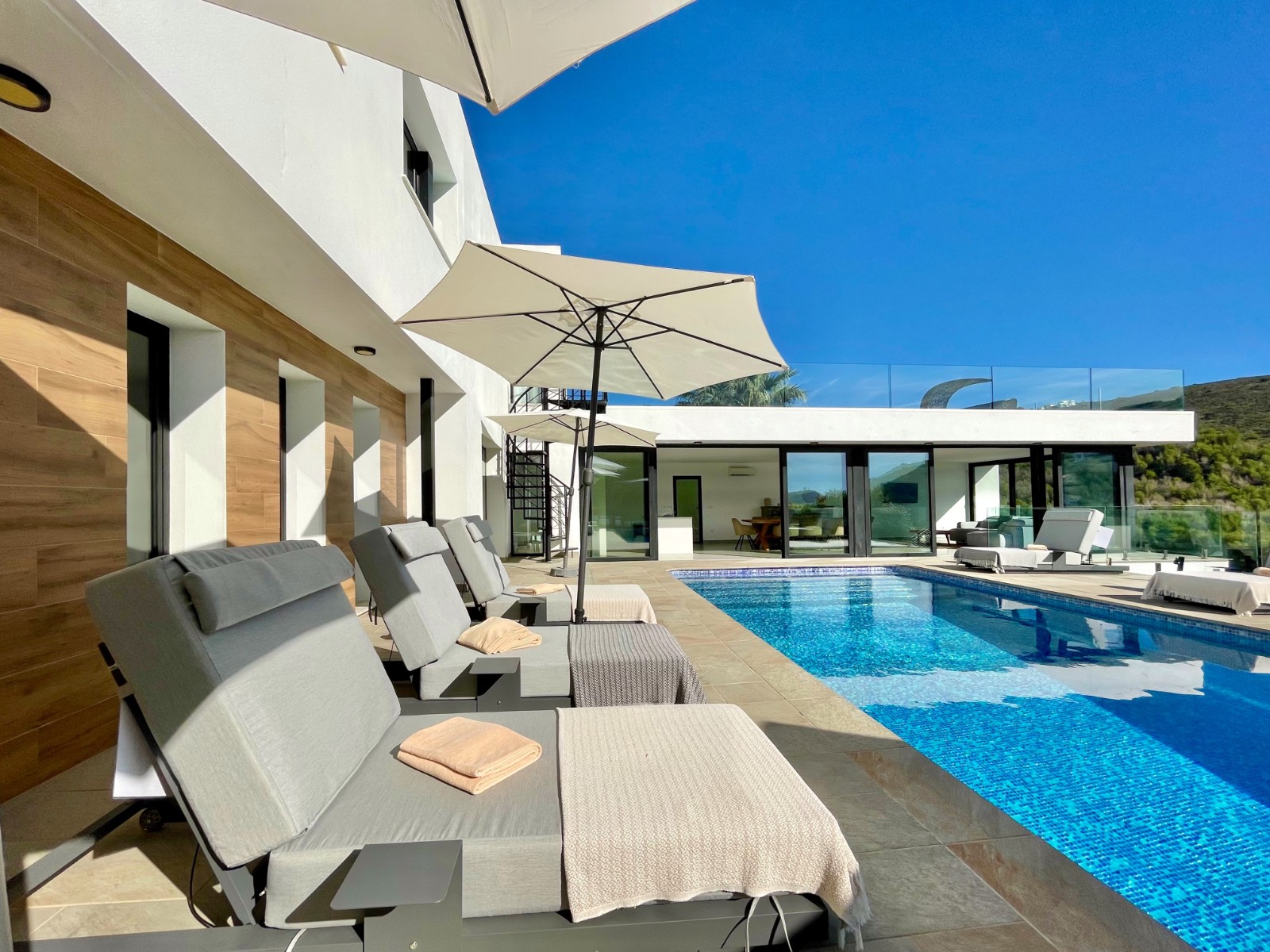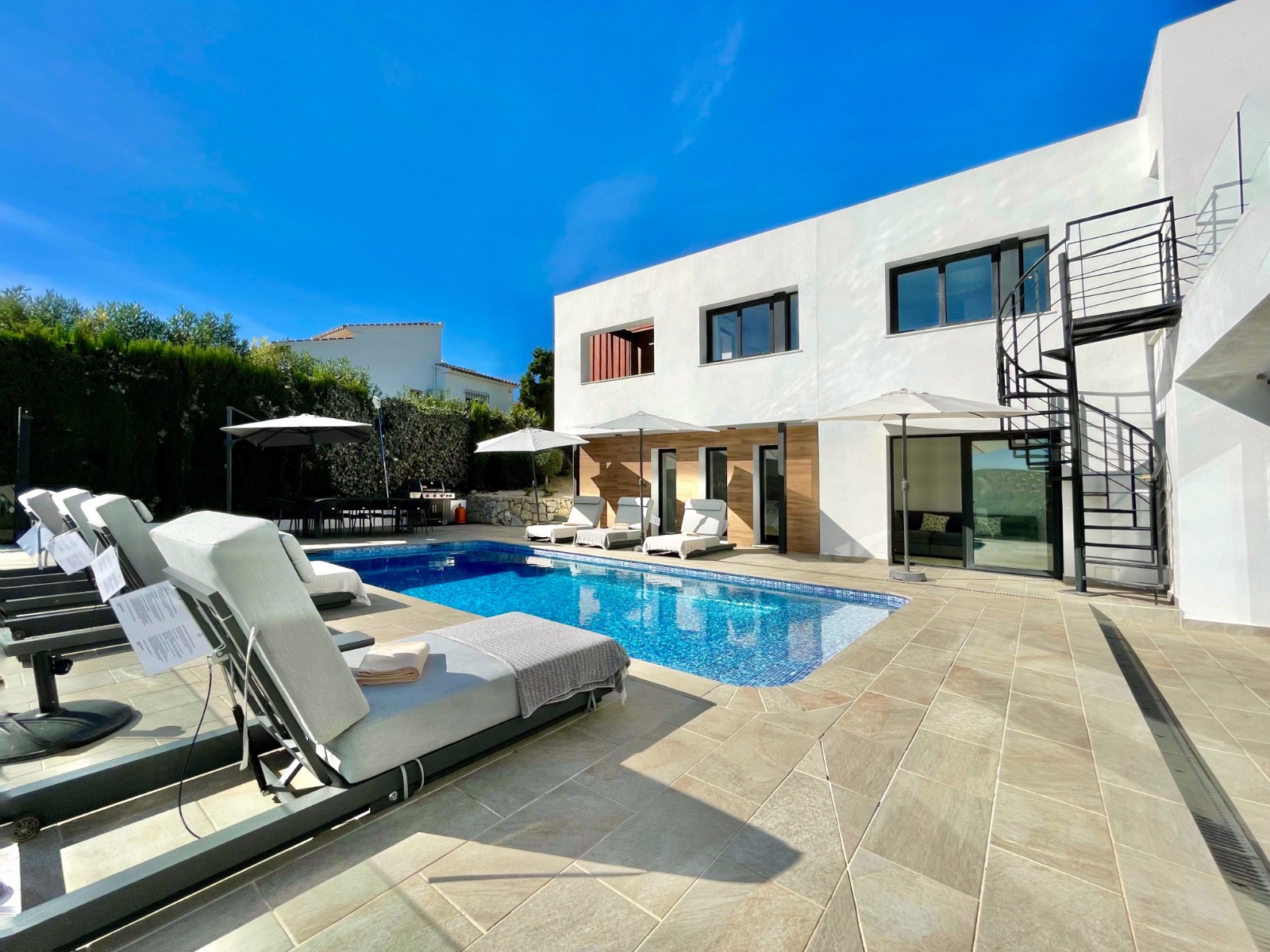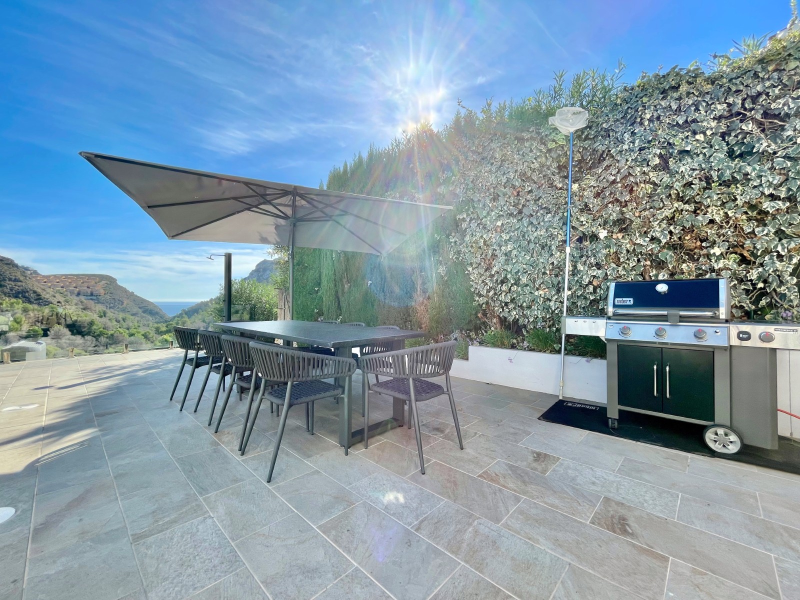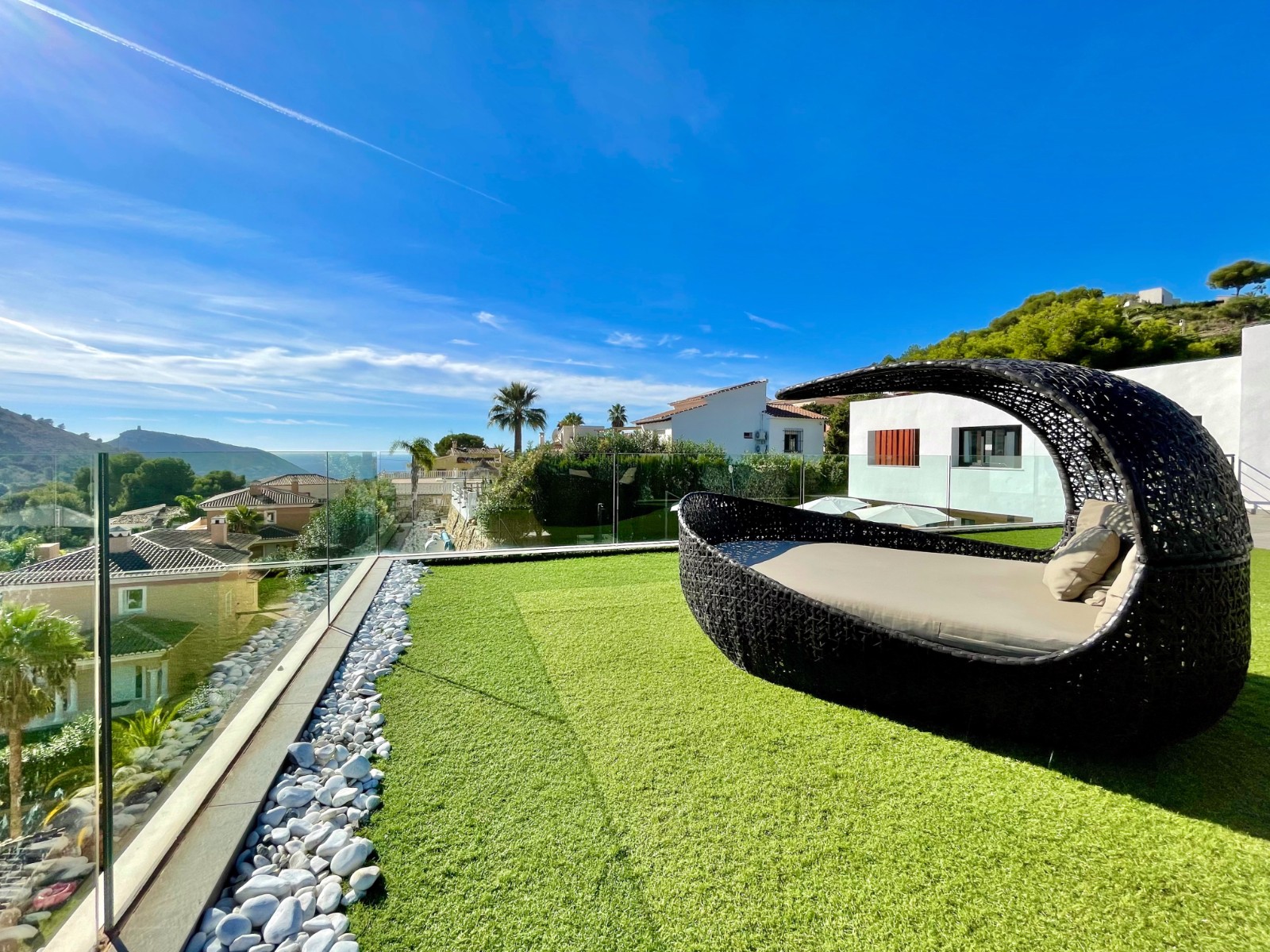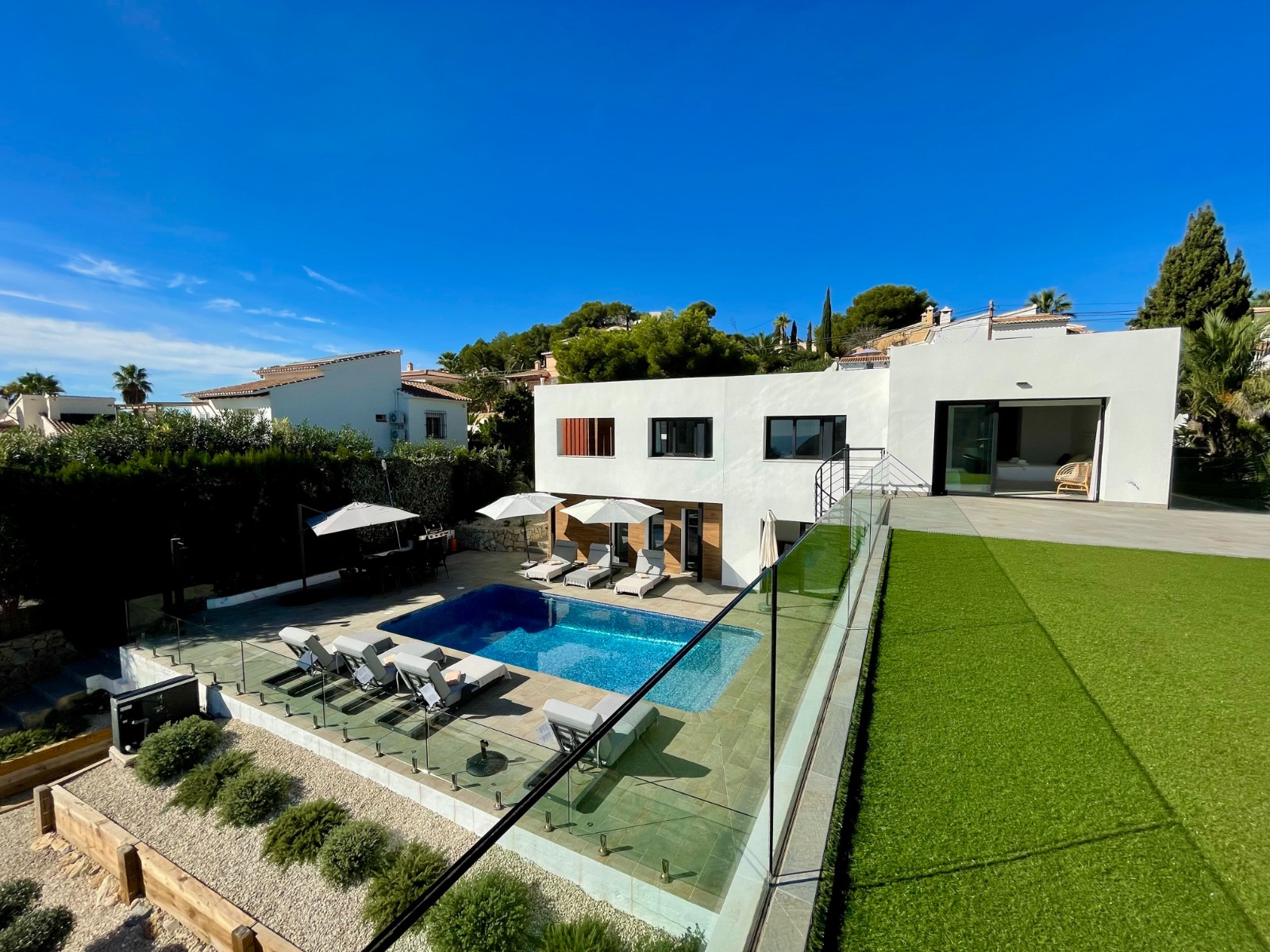 Una amplia terraza soleada con piscina privada ofrece el lugar perfecto para relajarse y disfrutar del maravilloso clima de la Costa Blanca. La piscina cuenta con calefacción y una ducha exterior, para que pueda nadar cómodamente durante todo el año. También hay una acogedora zona de barbacoa, ideal para cenas de verano con vistas al mar. El jardín está diseñado para facilitar su mantenimiento, lo que le da un aspecto limpio y cuidado. Además, la parcela ofrece suficiente espacio para aparcar y una cochera cerrada.