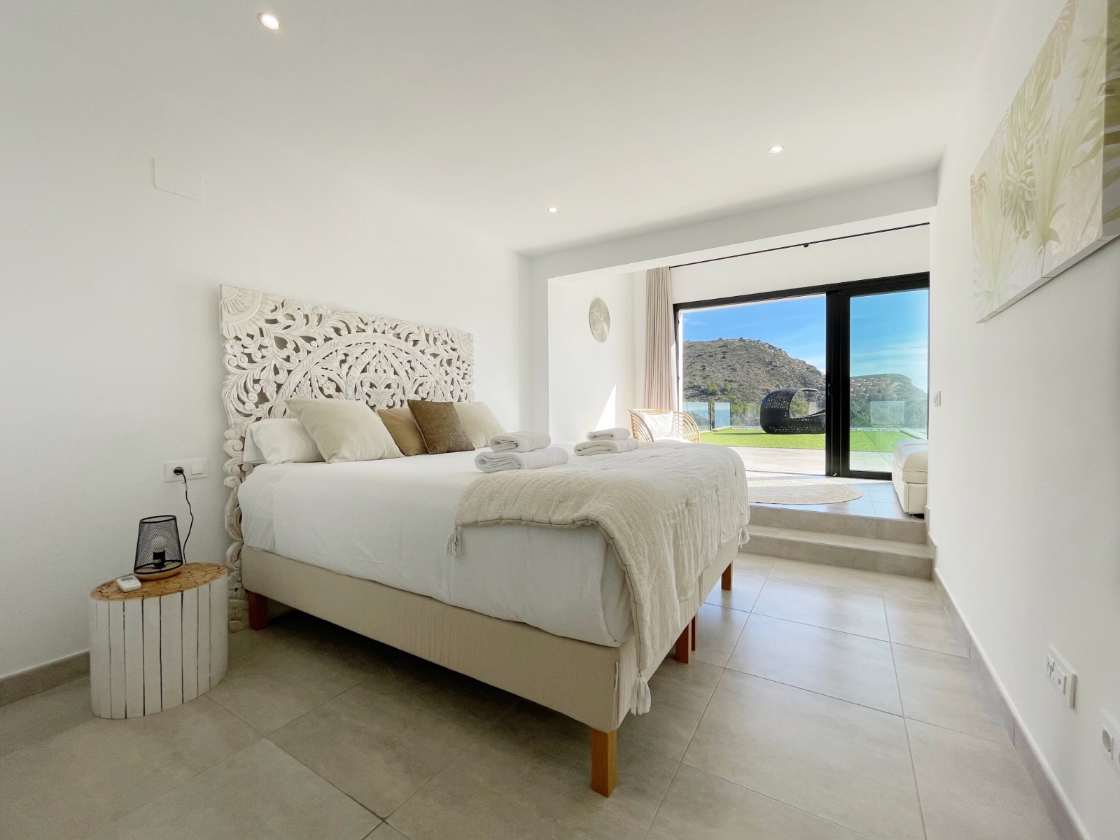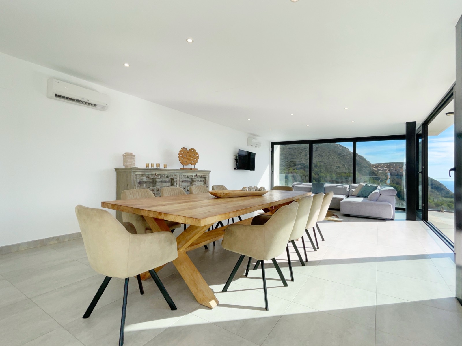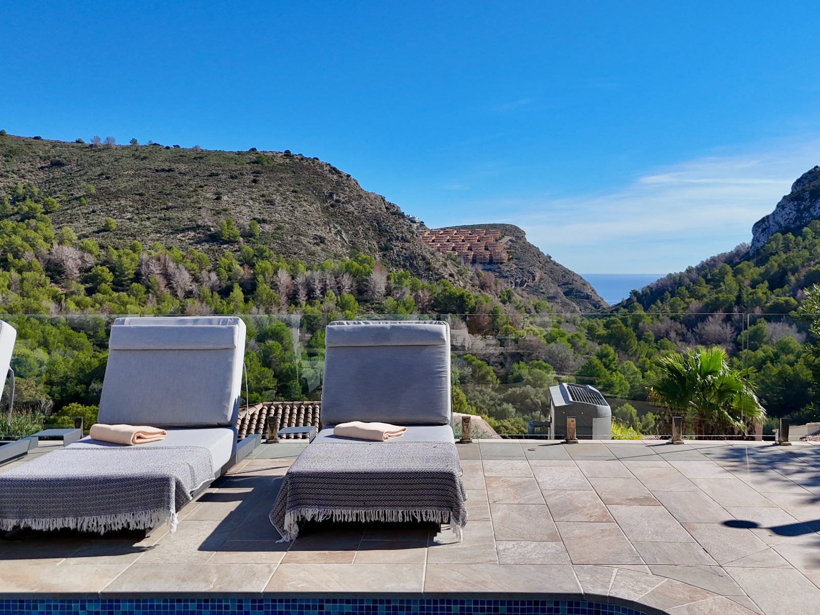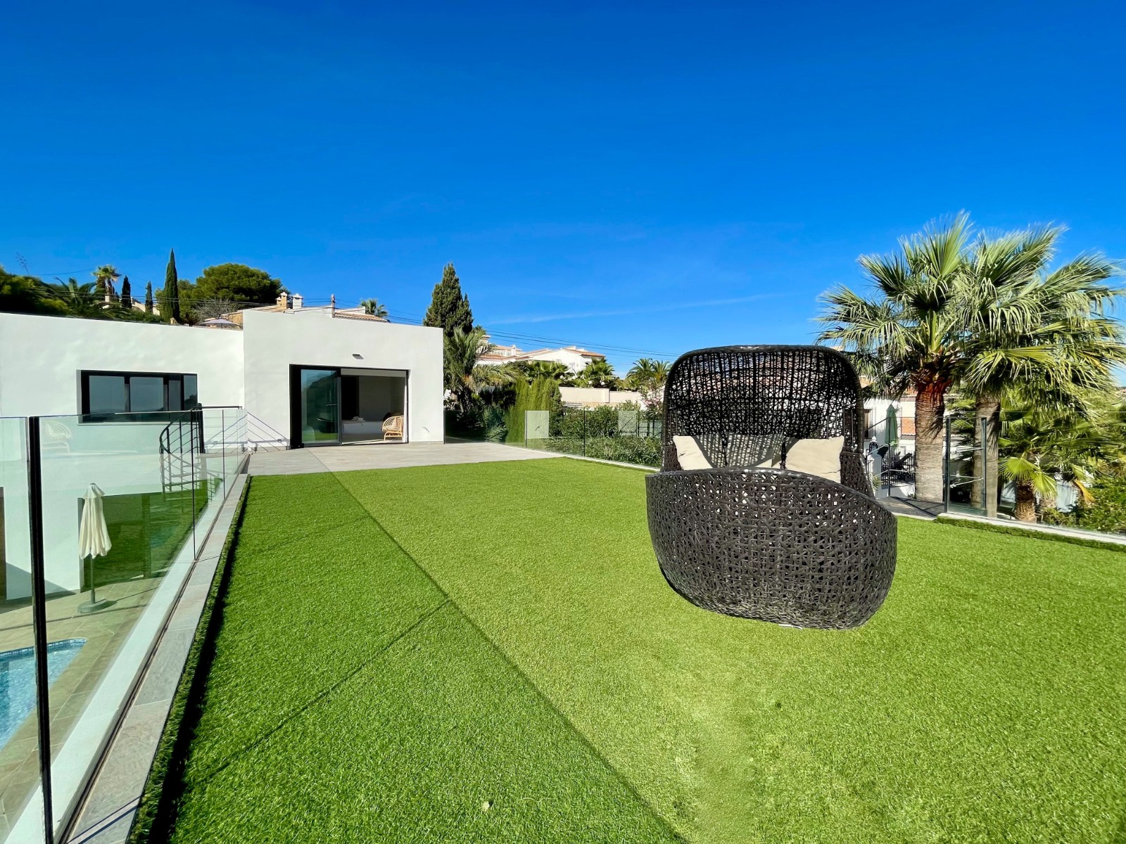 Una amplia terraza soleada con piscina privada ofrece el lugar perfecto para relajarse y disfrutar del maravilloso clima de la Costa Blanca. La piscina cuenta con calefacción y una ducha exterior, para que pueda nadar cómodamente durante todo el año. También hay una acogedora zona de barbacoa, ideal para cenas de verano con vistas al mar. El jardín está diseñado para facilitar su mantenimiento, lo que le da un aspecto limpio y cuidado. Además, la parcela ofrece suficiente espacio para aparcar y una cochera cerrada.