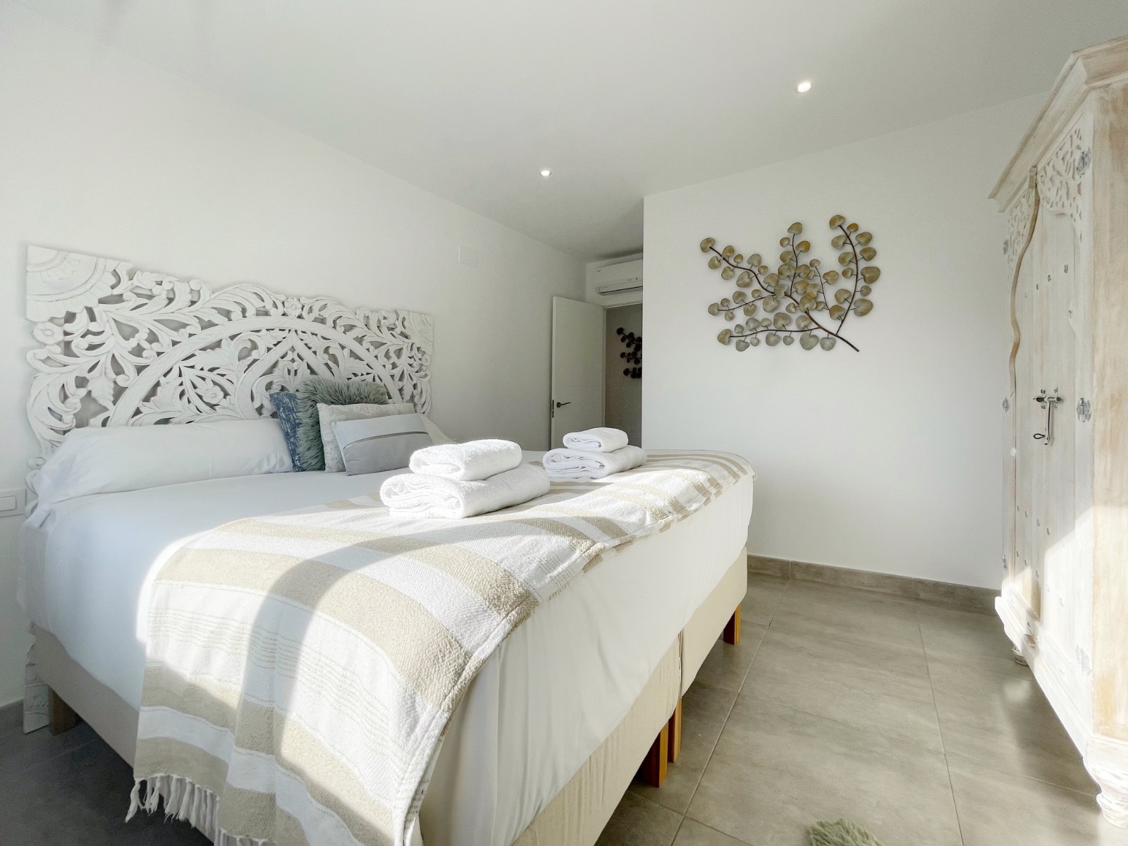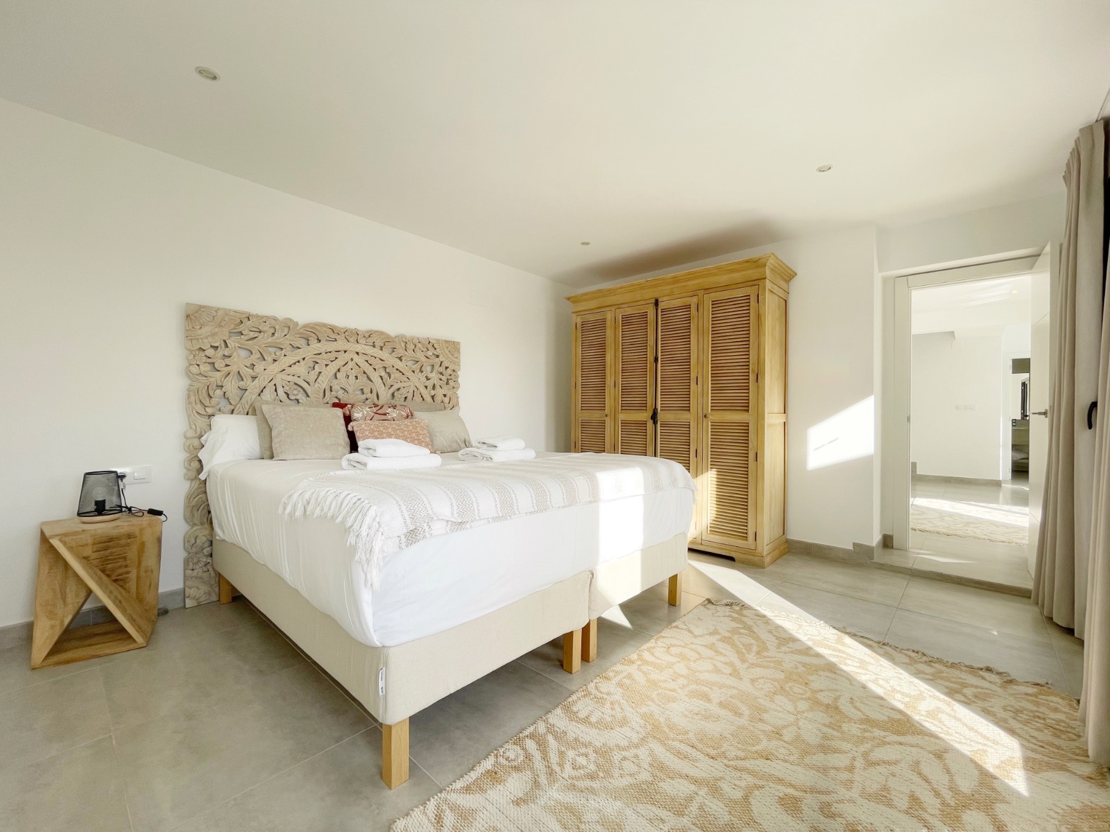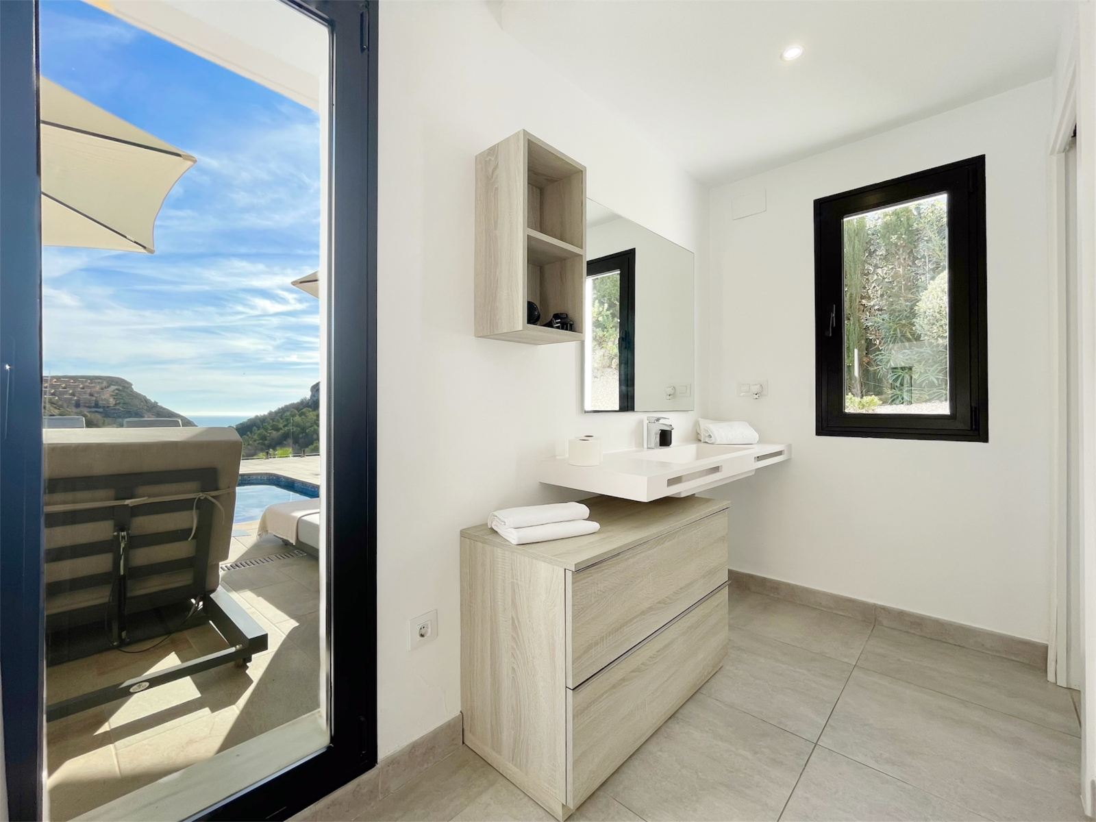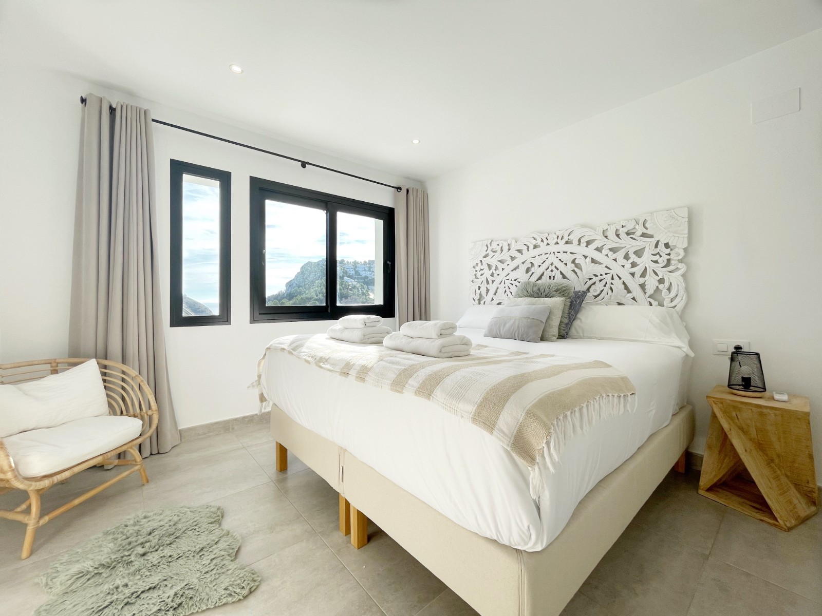 En la planta superior hay un amplio dormitorio principal con baño en suite y acceso directo a una terraza privada con magníficas vistas al mar y al verde entorno. Además, en esta planta hay otros dos dormitorios dobles que comparten un amplio cuarto de baño, uno de los cuales también tiene acceso a una terraza privada. Desde todos los dormitorios se disfruta de unas magníficas vistas al mar y al valle.