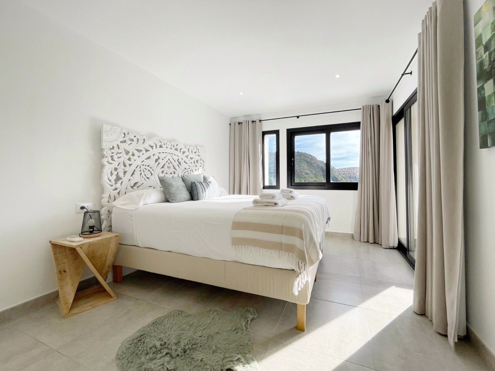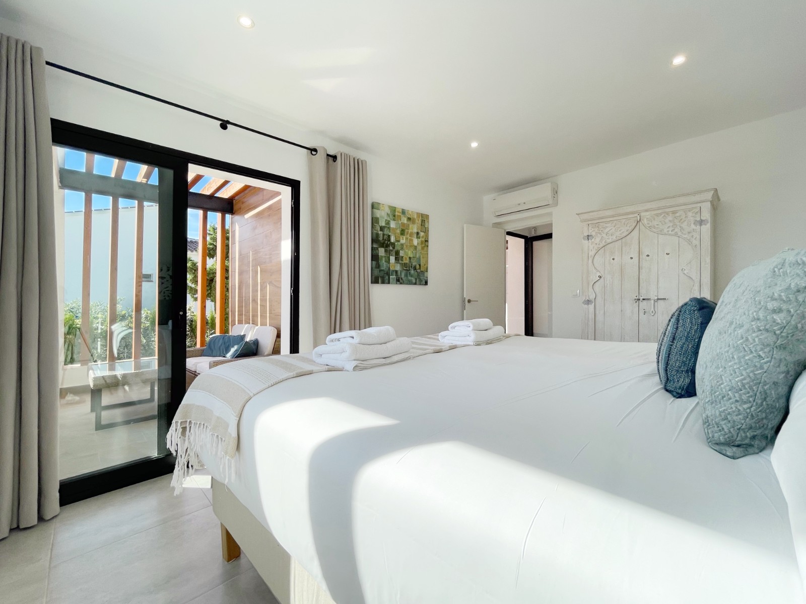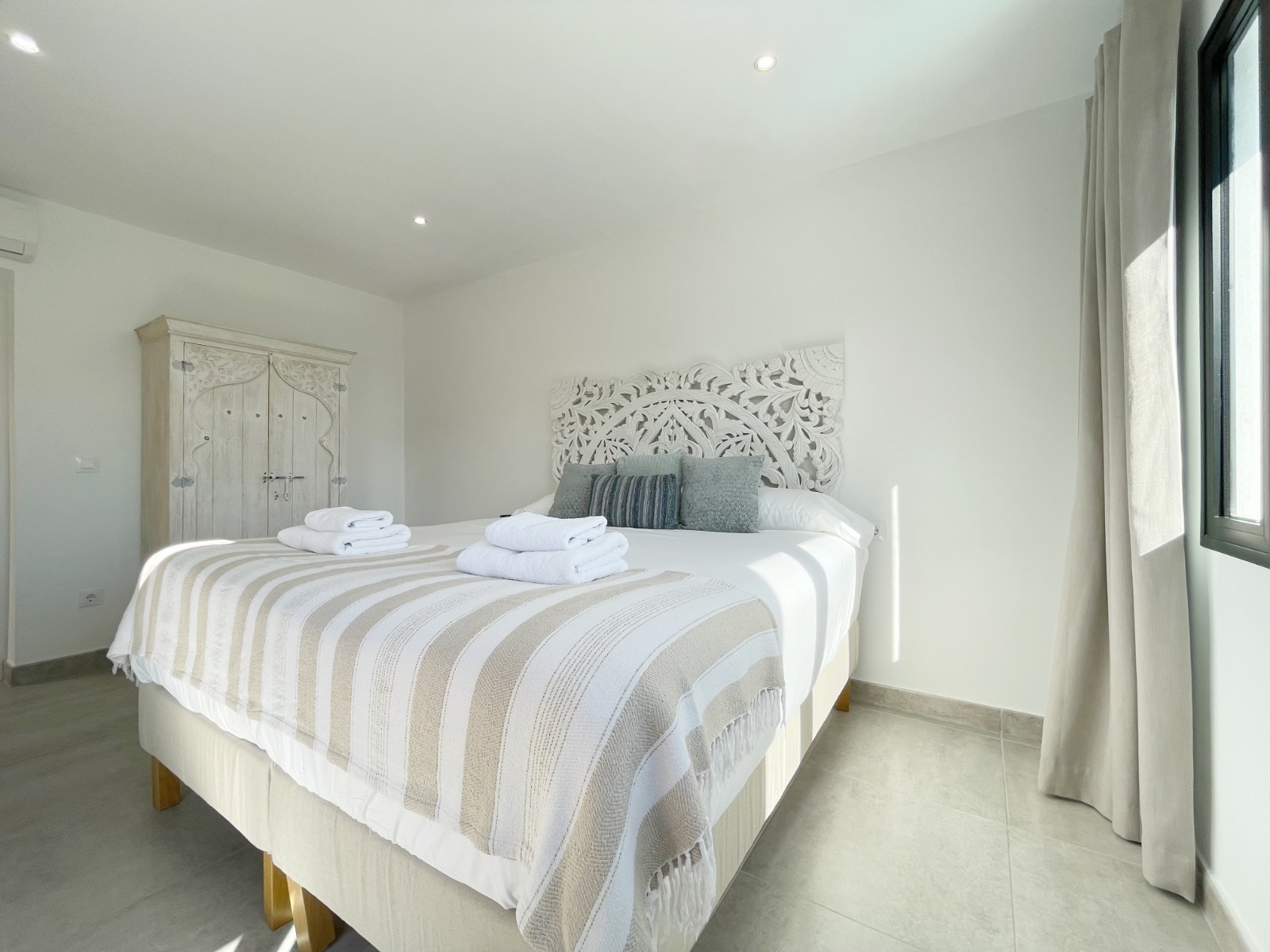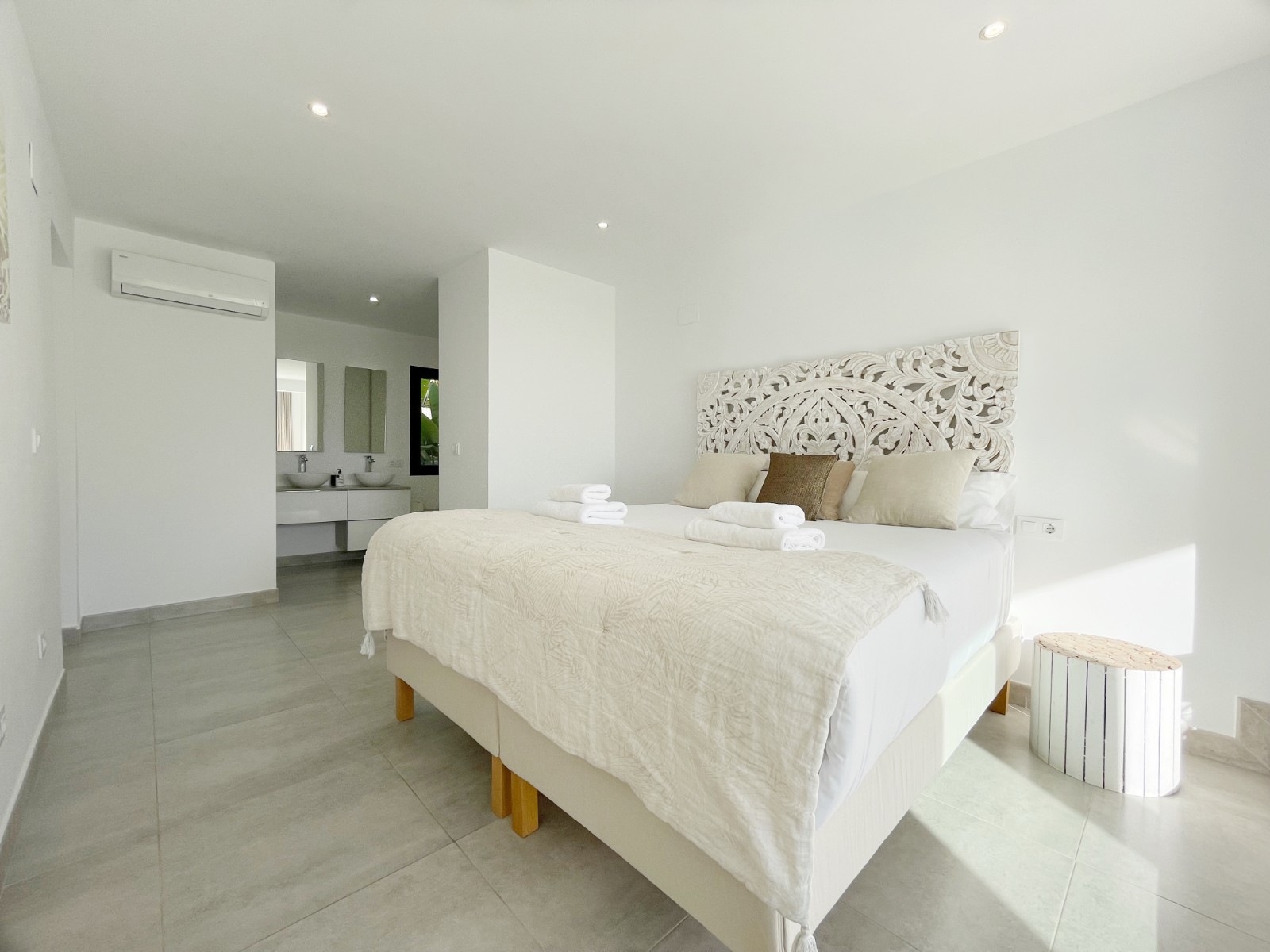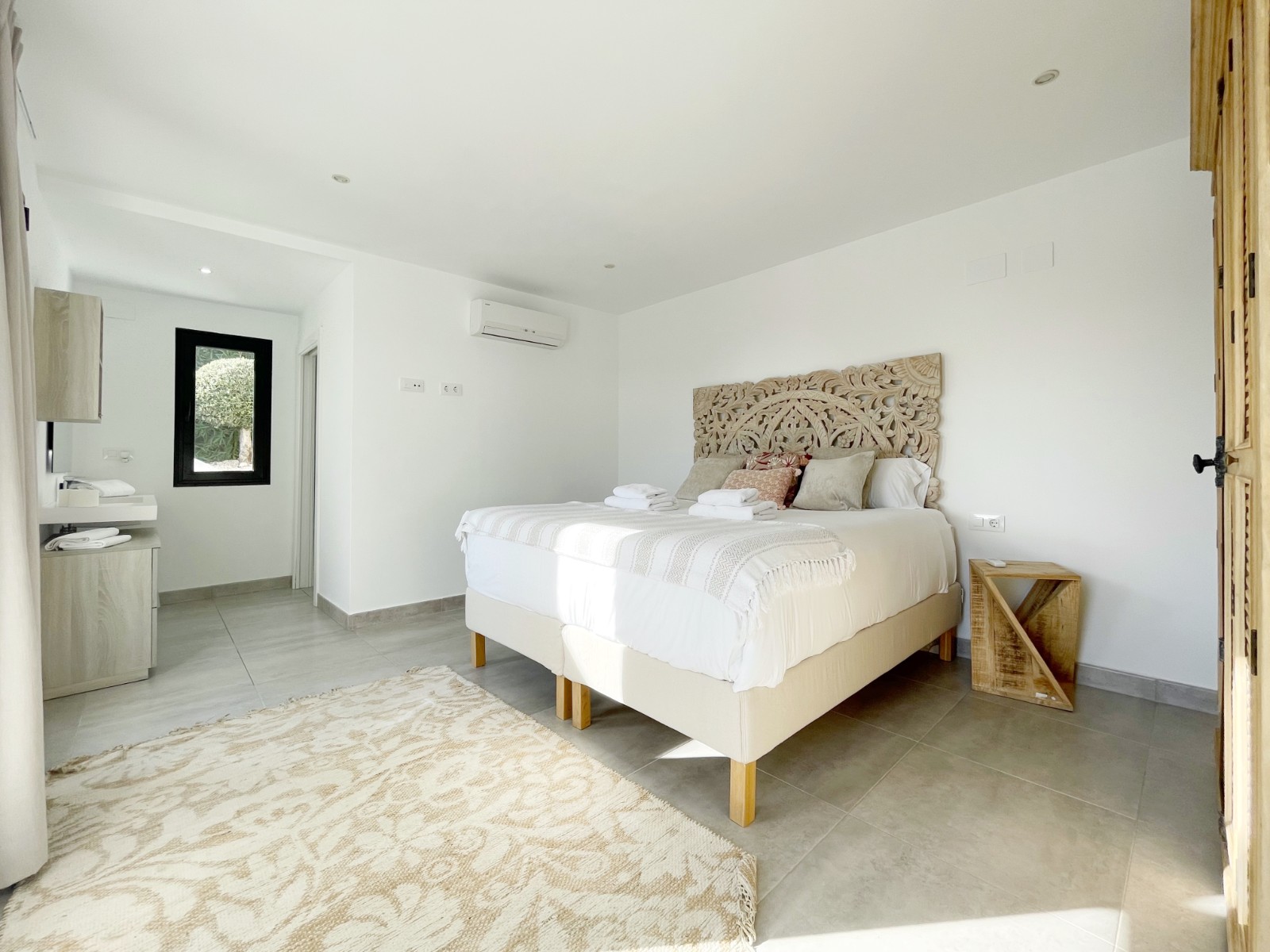 En la planta superior hay un amplio dormitorio principal con baño en suite y acceso directo a una terraza privada con magníficas vistas al mar y al verde entorno. Además, en esta planta hay otros dos dormitorios dobles que comparten un amplio cuarto de baño, uno de los cuales también tiene acceso a una terraza privada. Desde todos los dormitorios se disfruta de unas magníficas vistas al mar y al valle.