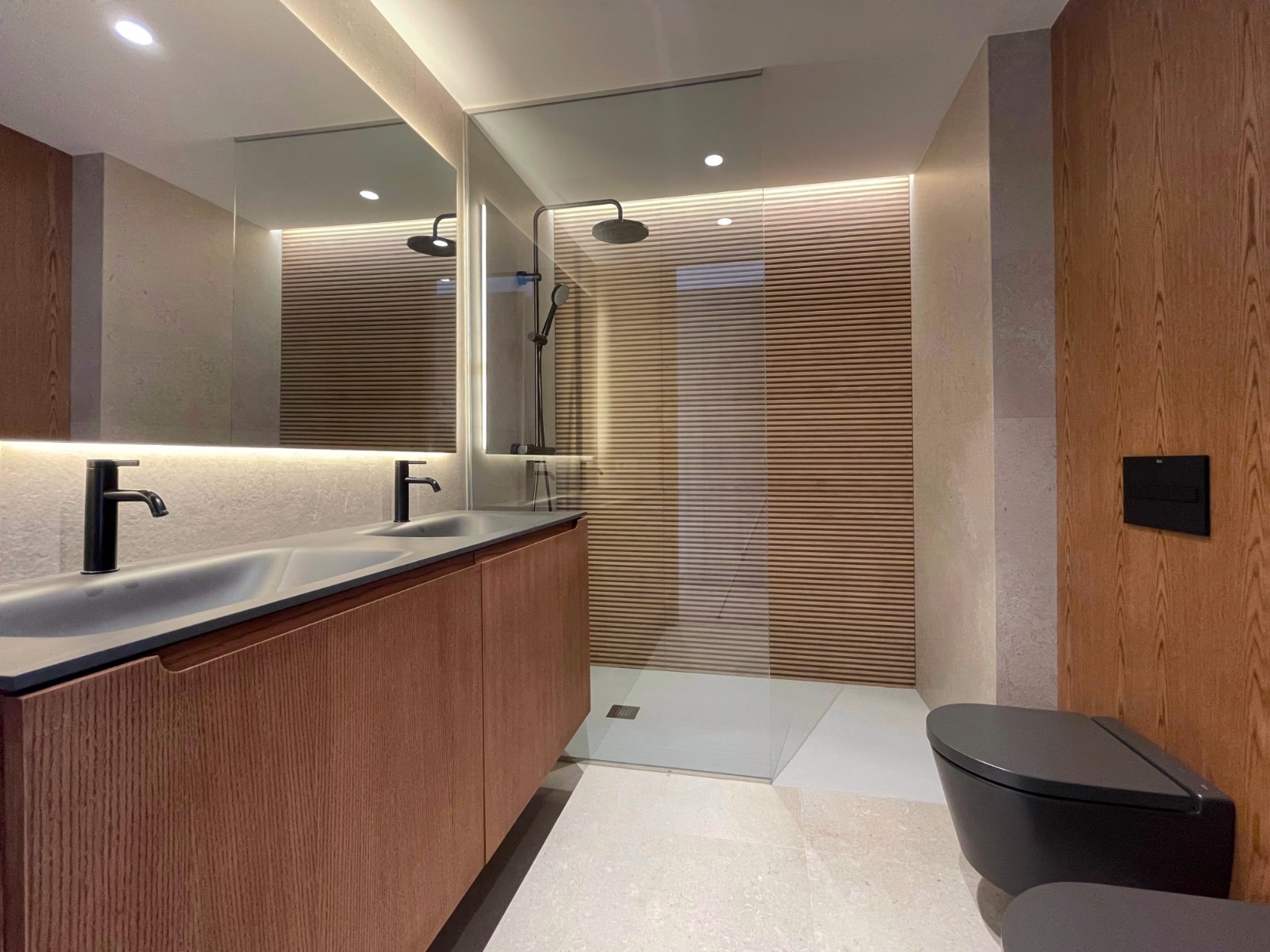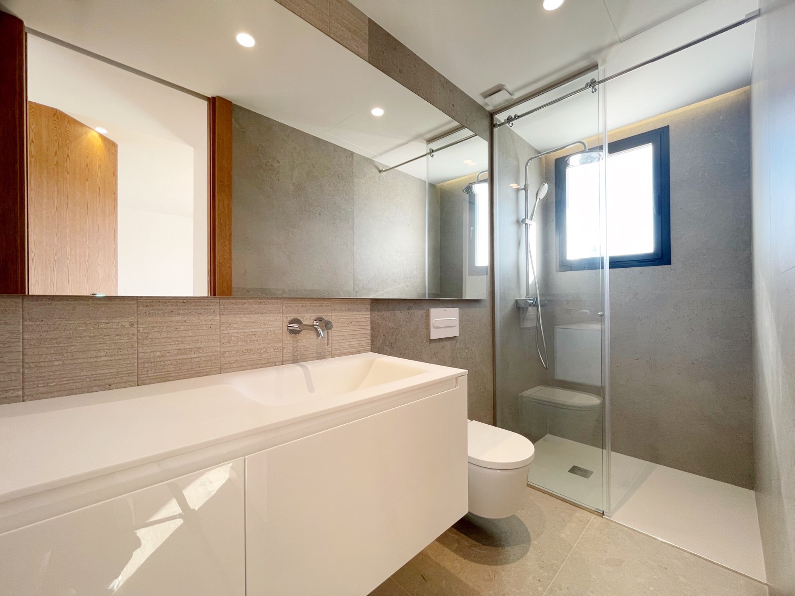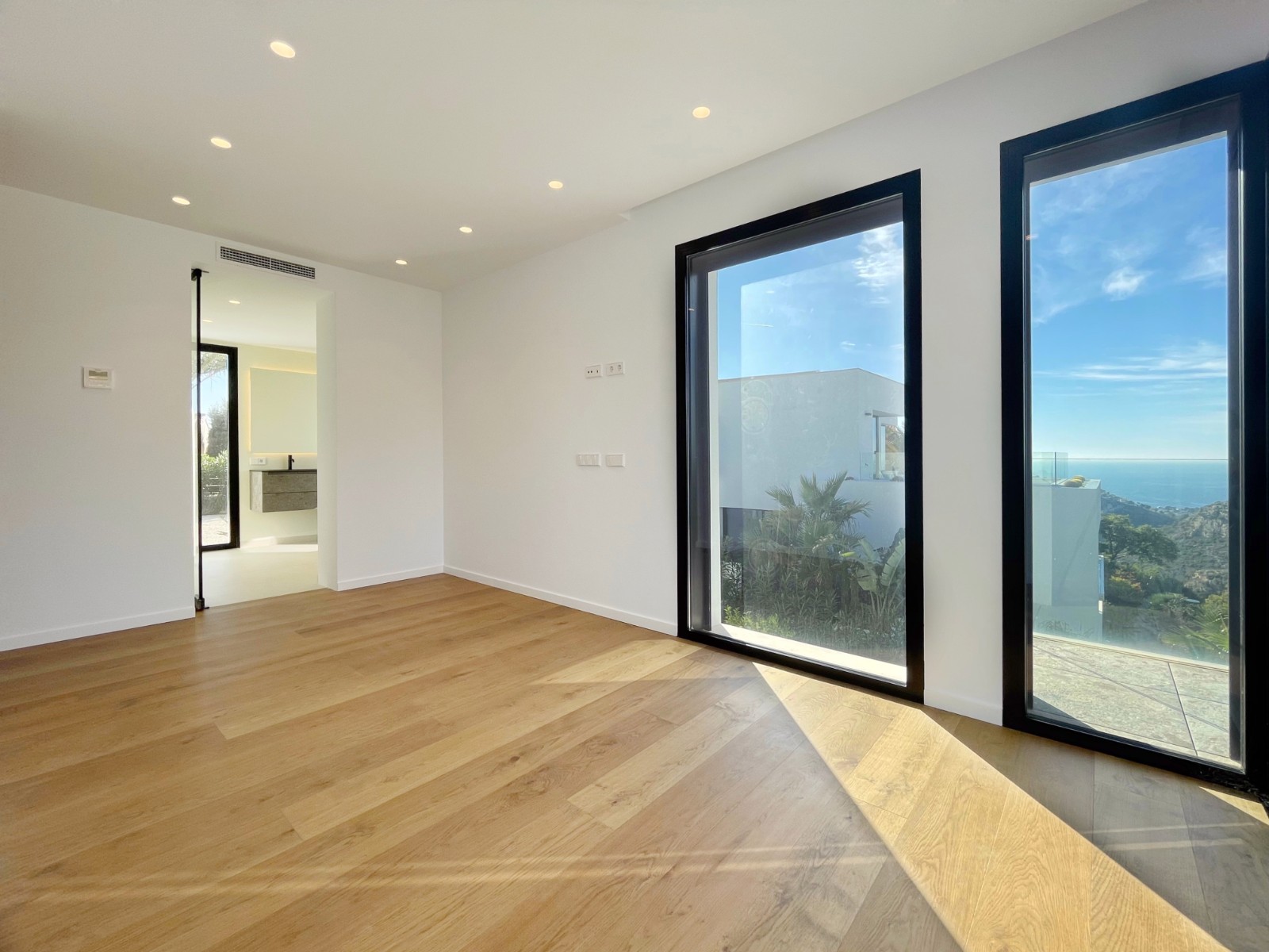 De bovenverdieping verwelkomt u met drie stijlvolle slaapkamers, elk voorzien van een luxe en-suite badkamer en ingebouwde kasten. Twee van deze kamers beschikken bovendien over een privéterras met prachtig uitzicht richting de zee en de groene vallei.