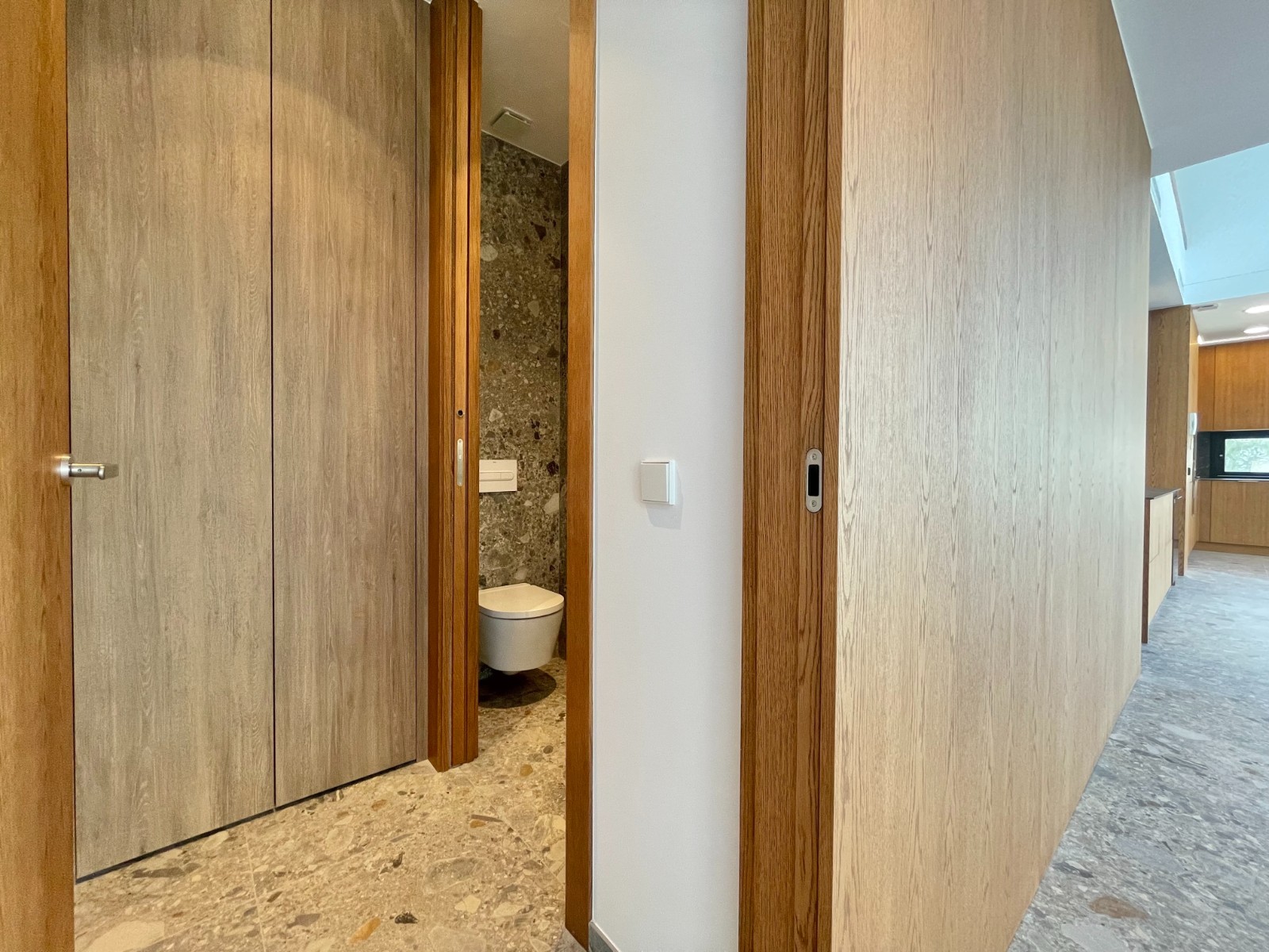 Via de interne trap bereikt u het centrale leefgedeelte: een lichte, ruime woonkamer met moderne open haard, verbonden met een strakke open keuken en eetruimte. een lichte en royale woonkamer met moderne open haard, verbonden met een strakke open keuken en eetruimte. Grote schuifpuien laten binnen en buiten naadloos in elkaar overlopen, waardoor het ruime terras met privézwembad een verlengstuk wordt van de woonruimte.Op deze verdieping bevinden zich ook een gastentoilet en een praktische was- en bergruimte. Aan de achterzijde ligt een beschutte, onderhoudsvriendelijke tuin.