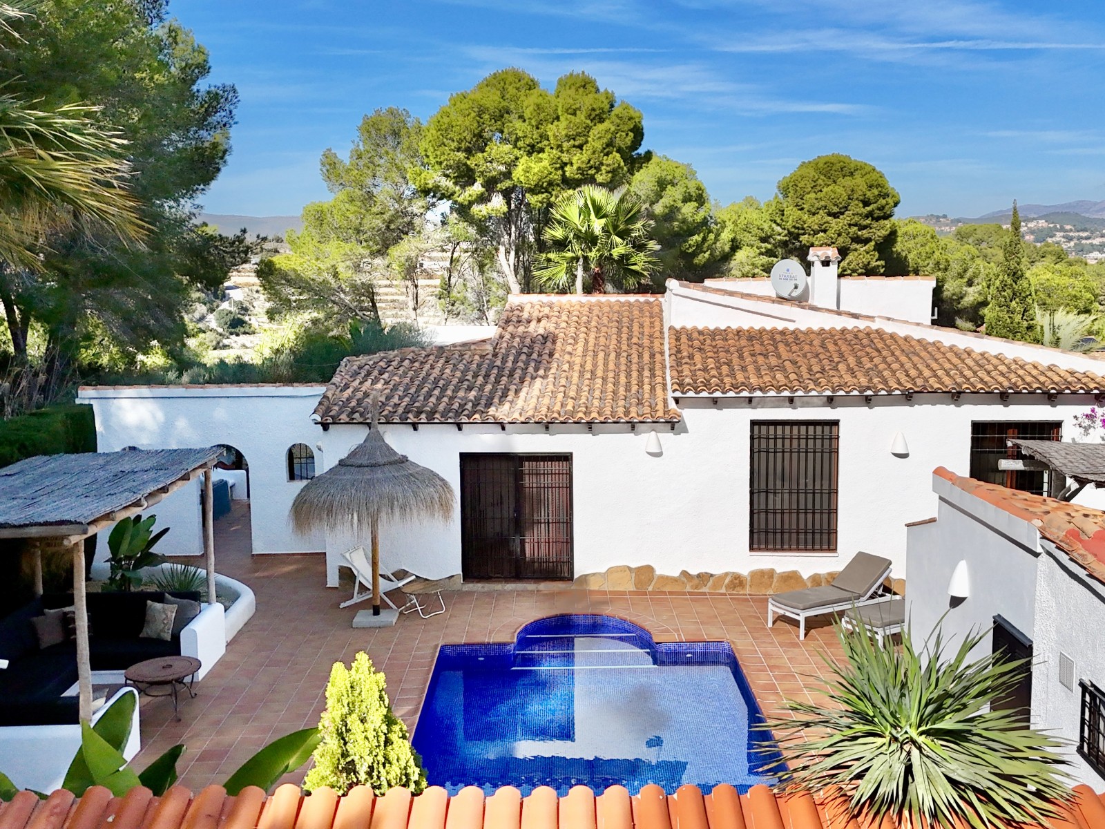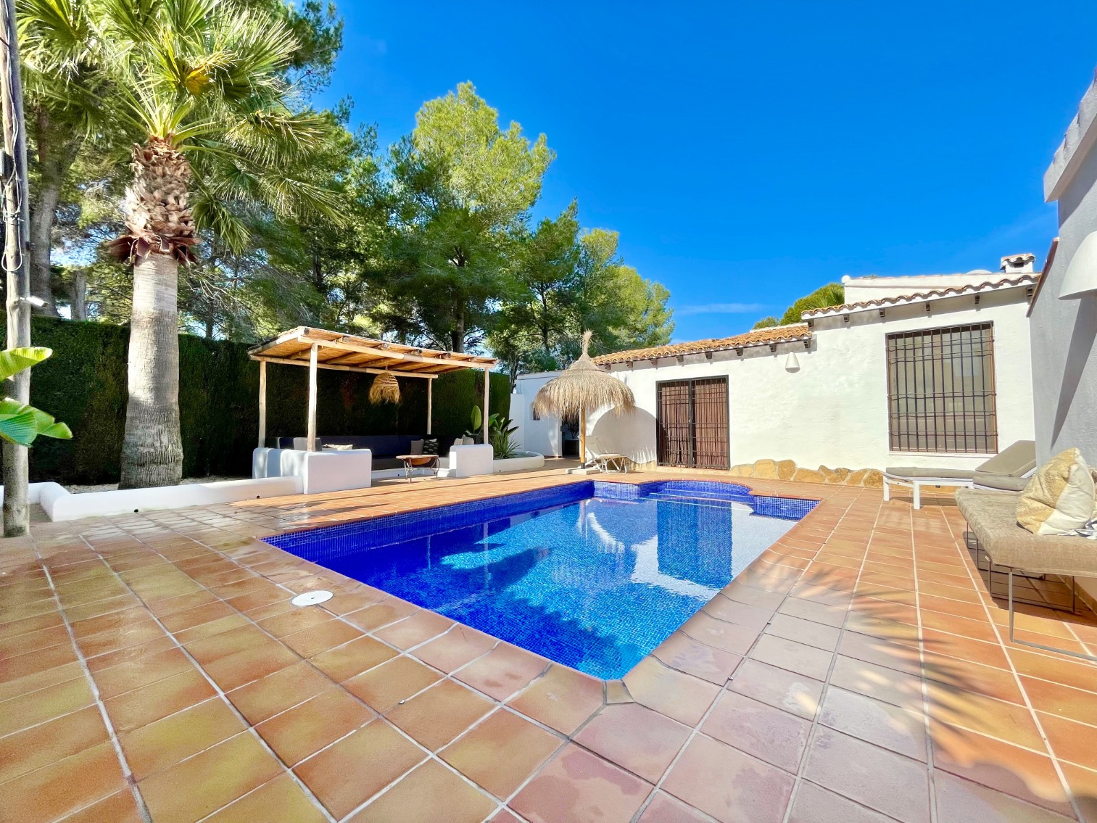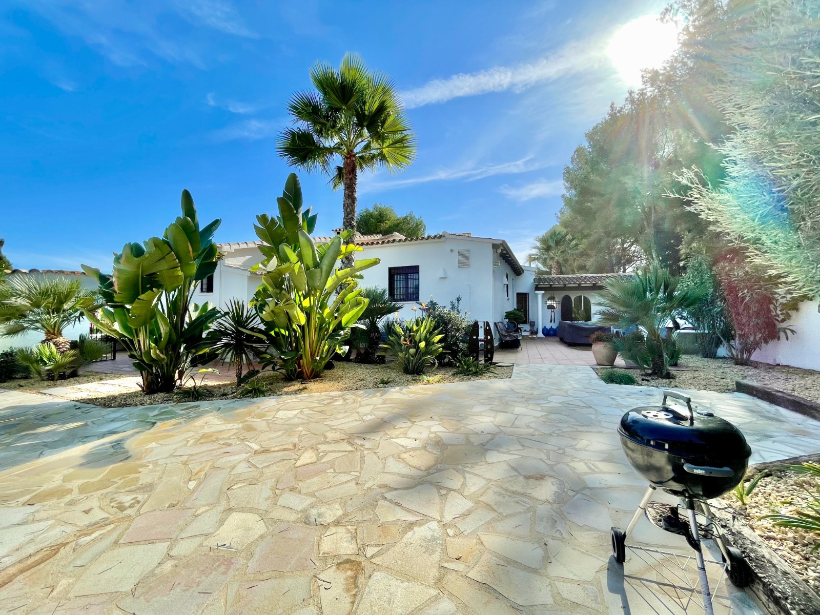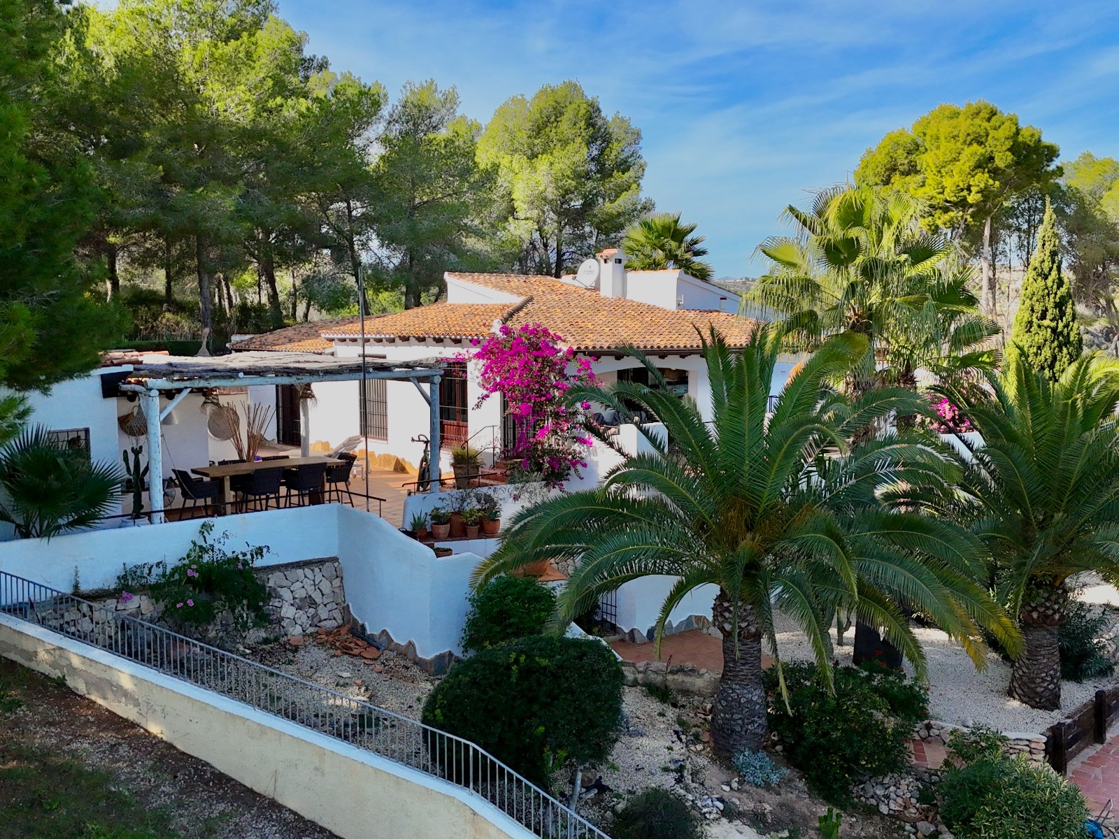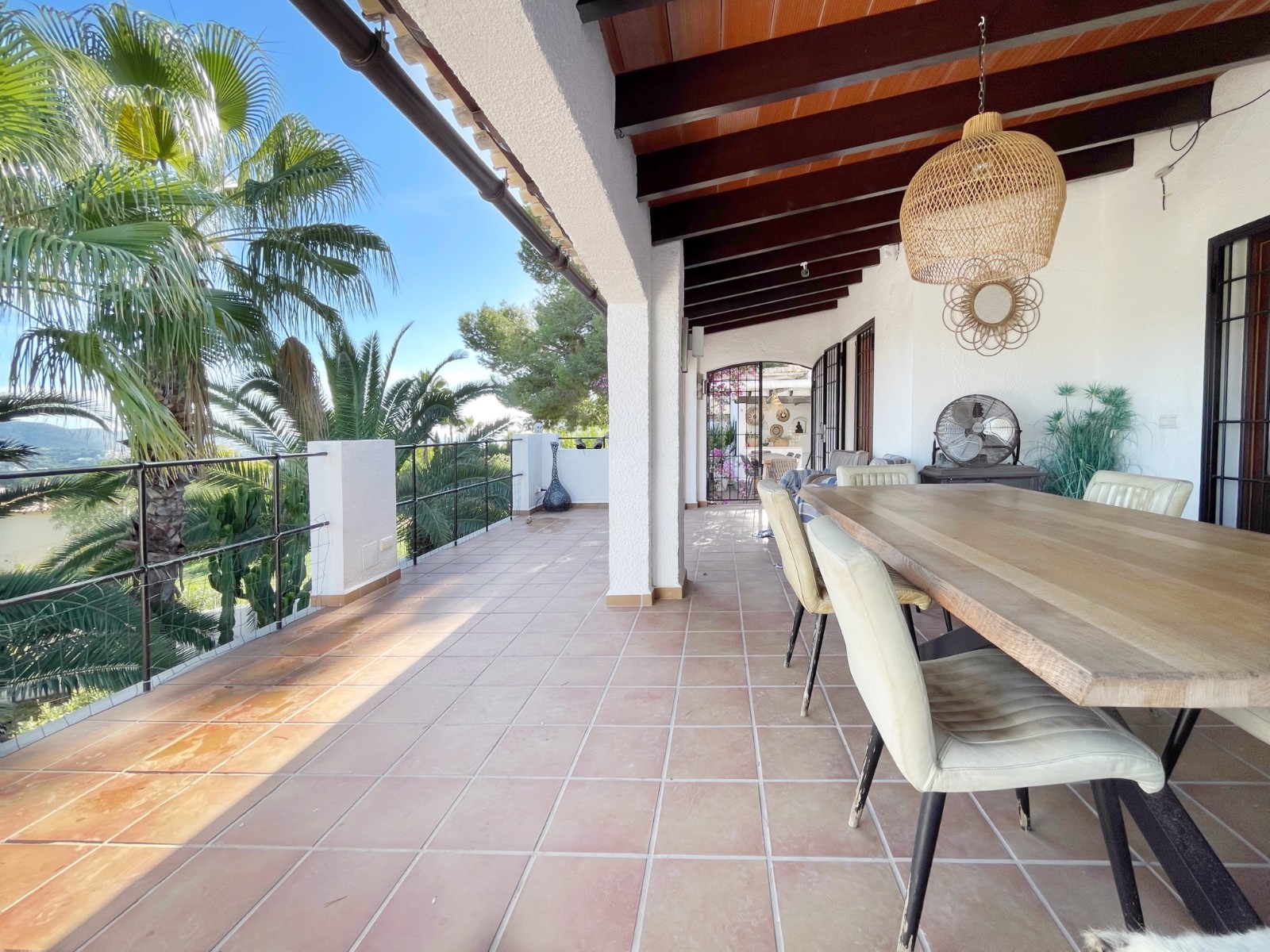 Gezellige villa gelegen in een rustig gedeelte van de gewilde wijk Benimeit van Moraira. Rondom de woning vinden we, naast natuurlijk het zwembadterras, diverse terrassen met zitjes en loungehoeken in zon en schaduw, waarvan meerdere ook voorzien zijn van schitterende pergola’s. De tuin is heel mooi aangelegd en schept een hele fijne sfeer, de mooie uitlichting doet daar ’s avonds nog een schepje bovenop. Tevens loopt men vanuit de schitterende houten toegangspoort aan de achterzijde zo direct de natuur tussen Moraira en Teulada in, tegelijkertijd zit men ook in maar 6 autominuutjes in hartje Moraira centrum . Er bestaat de mogelijkheid de woning verder uit te breiden en zelfs het splitsen van het kavel in 2 grondstukken behoort tot de mogelijkheden.