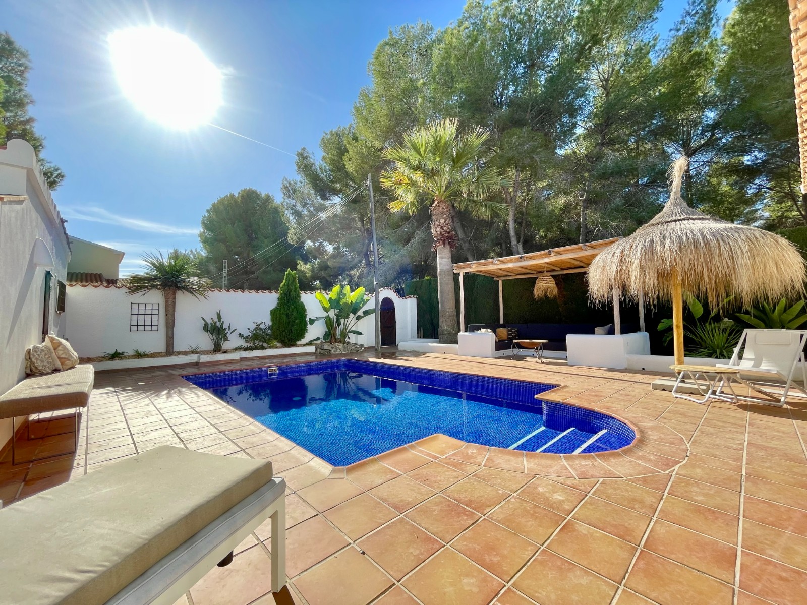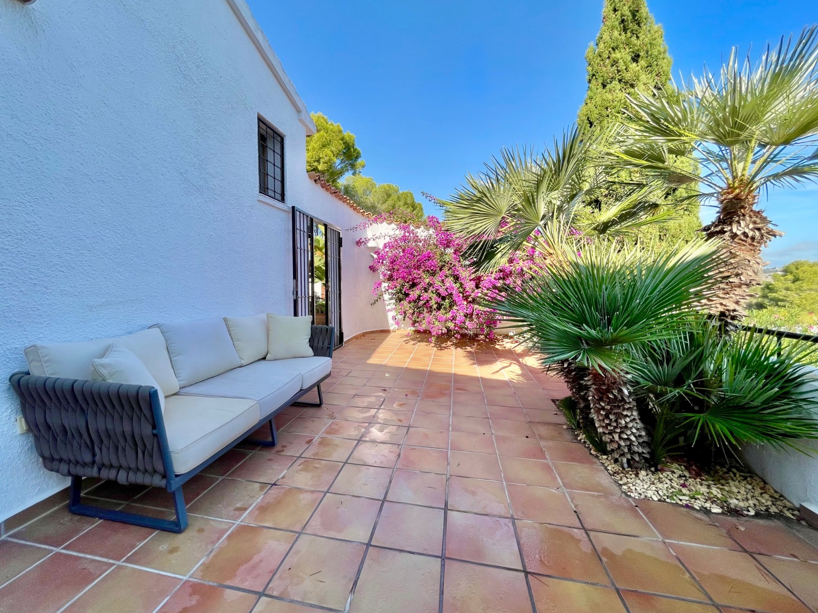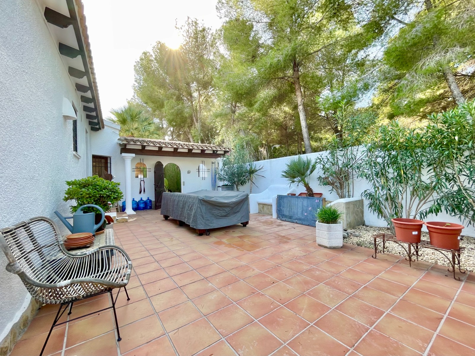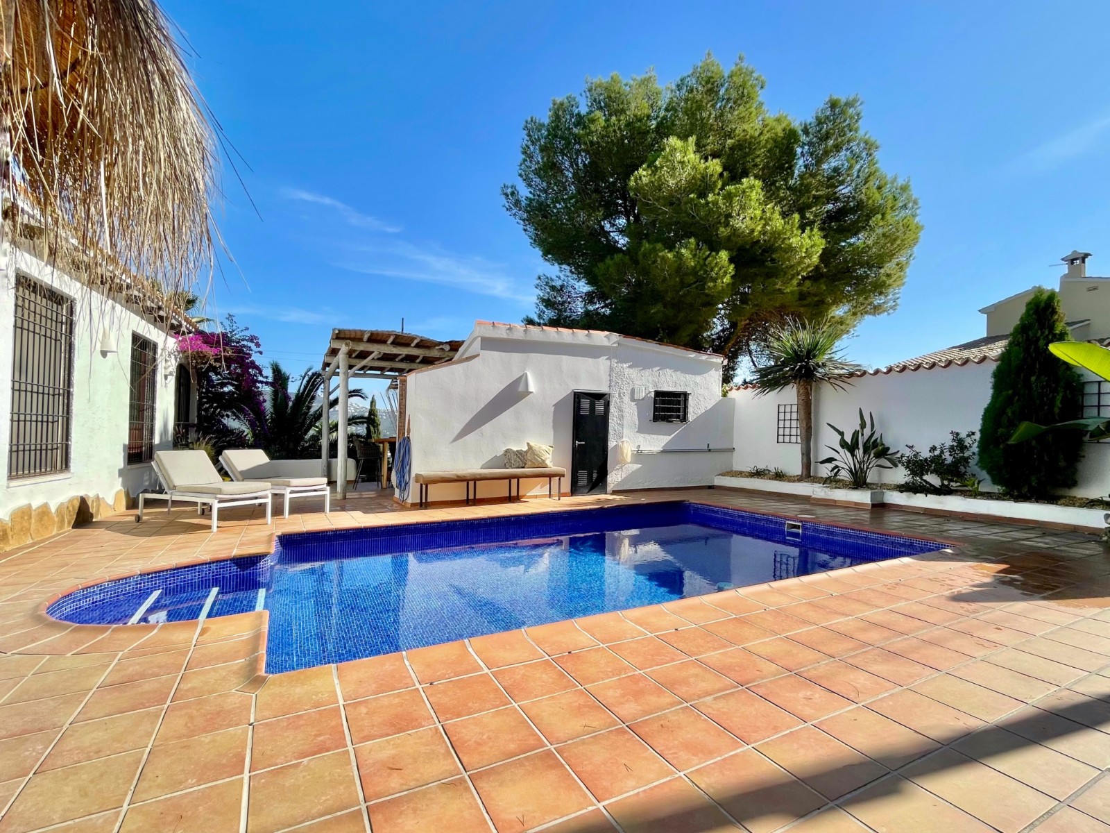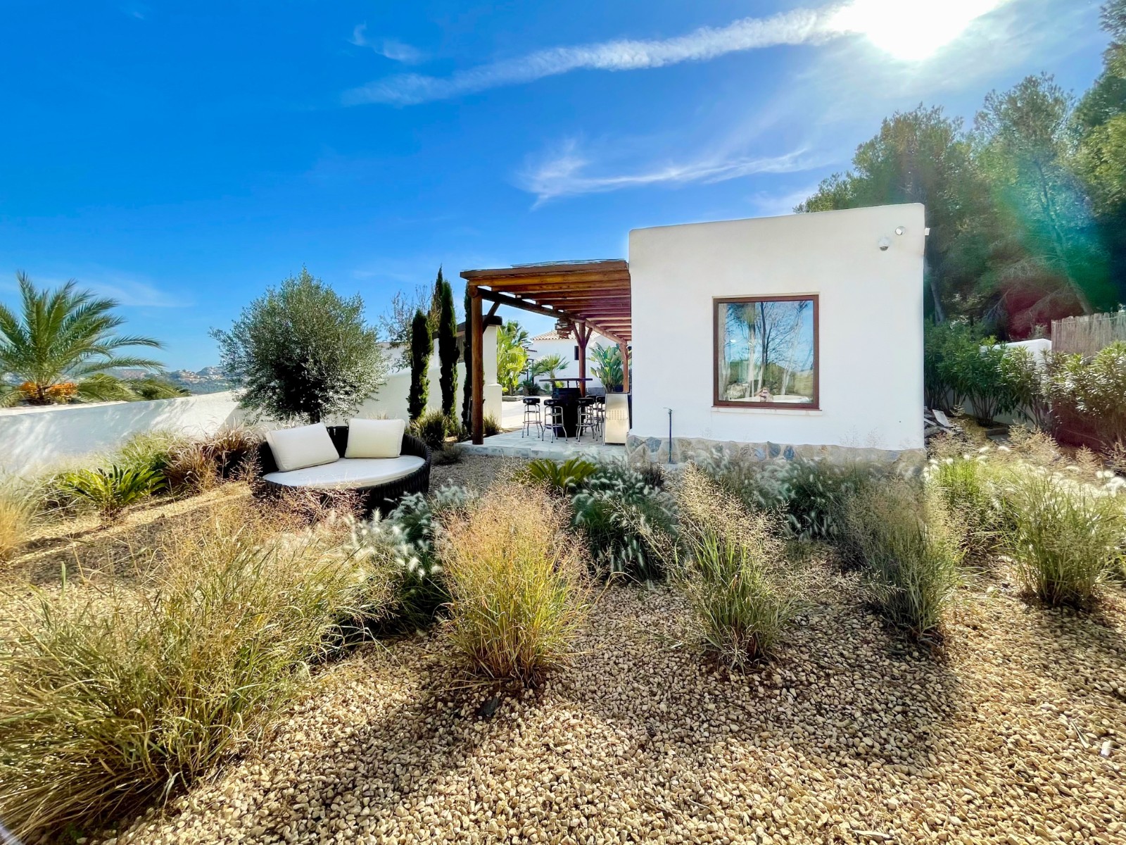 Gezellige villa gelegen in een rustig gedeelte van de gewilde wijk Benimeit van Moraira. Rondom de woning vinden we, naast natuurlijk het zwembadterras, diverse terrassen met zitjes en loungehoeken in zon en schaduw, waarvan meerdere ook voorzien zijn van schitterende pergola’s. De tuin is heel mooi aangelegd en schept een hele fijne sfeer, de mooie uitlichting doet daar ’s avonds nog een schepje bovenop. Tevens loopt men vanuit de schitterende houten toegangspoort aan de achterzijde zo direct de natuur tussen Moraira en Teulada in, tegelijkertijd zit men ook in maar 6 autominuutjes in hartje Moraira centrum . Er bestaat de mogelijkheid de woning verder uit te breiden en zelfs het splitsen van het kavel in 2 grondstukken behoort tot de mogelijkheden.