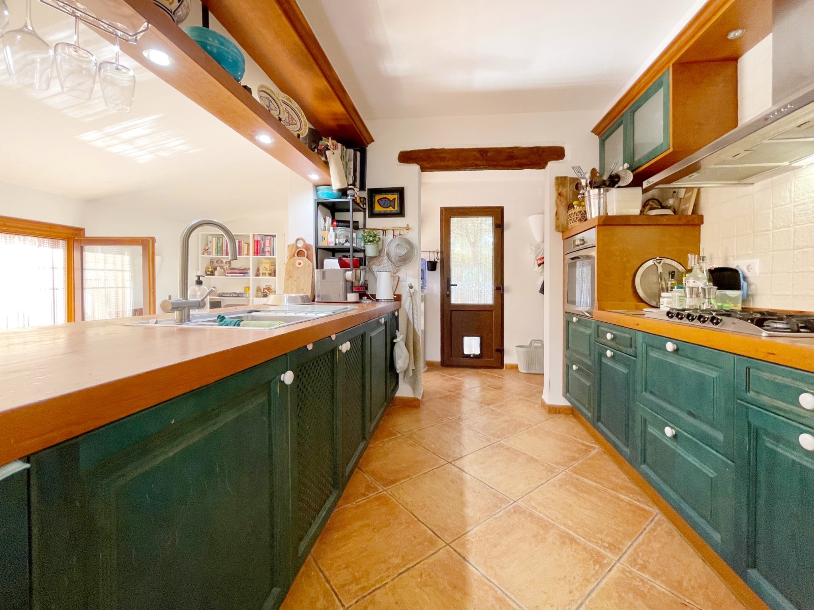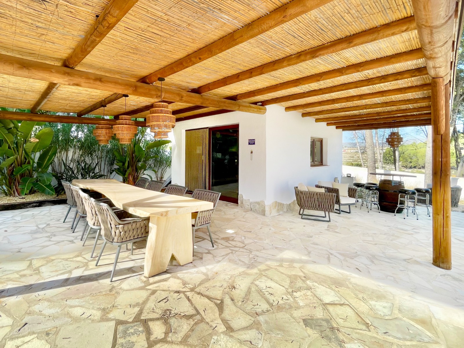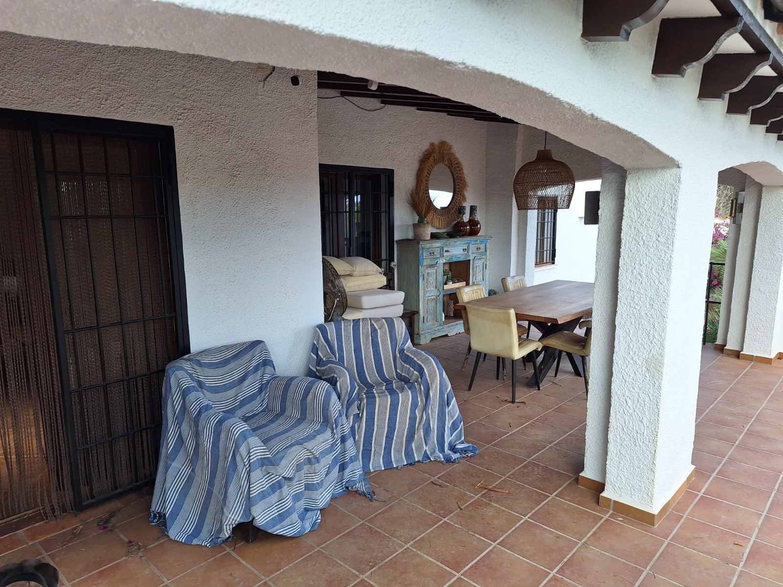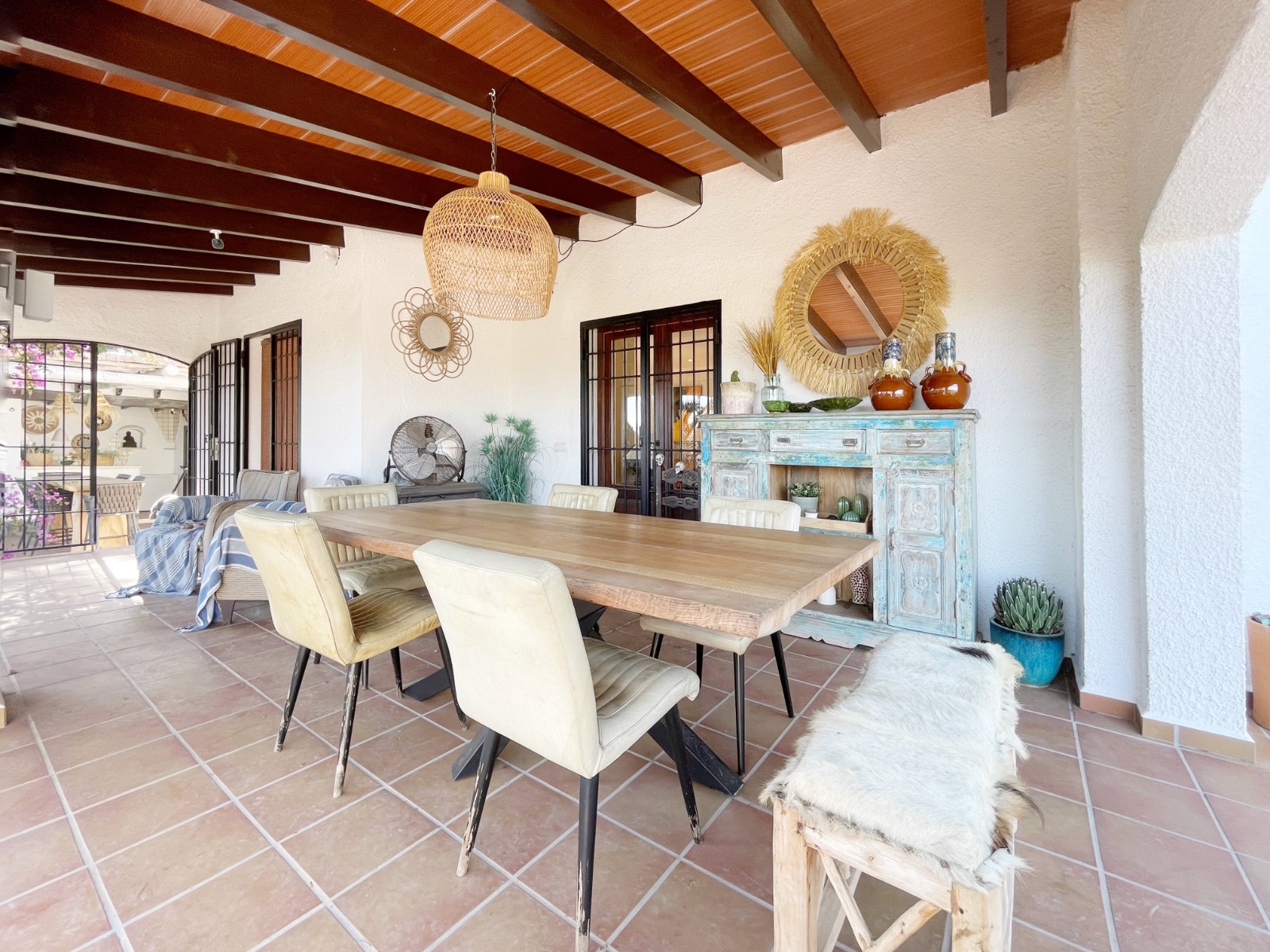Naast de hoofdingang met een voetgangersdeur kan men ook via de achterzijde het perceel betreden via een grote houten poort of via de automatische poort. Hier vinden we ook 2 garages, waarvan er 1 momenteel in gebruik is als opslagruimte en de ander is omgevormd tot een echte “man cave”, die natuurlijk ook als b.v. extra slaapkamer of gym e.d. zou kunnen dienen . De woning zelf beschikt over een ruime gezellige woonkamer met veel lichtinval via de openslaande deuren, 2 slaapkamers (beide voorzien van airco) en 2 badkamers, waarvan 1 en suite. De keuken is verbonden met een iets lager gelegen kamer, momenteel in gebruik als kantoor (maar kan ook omgevormd worden tot een extra slaapkamer) en biedt tevens toegang tot een bijkeuken. Grenzend aan de woonkamer ook weer een leuk terras voorzien van een lange statafel onder een pergola en een praktische buitenkeuken. Ook het 8 x 4 M. grootte zwembad is omringd door een ruim terras met o.a. een gezellige loungehoek.