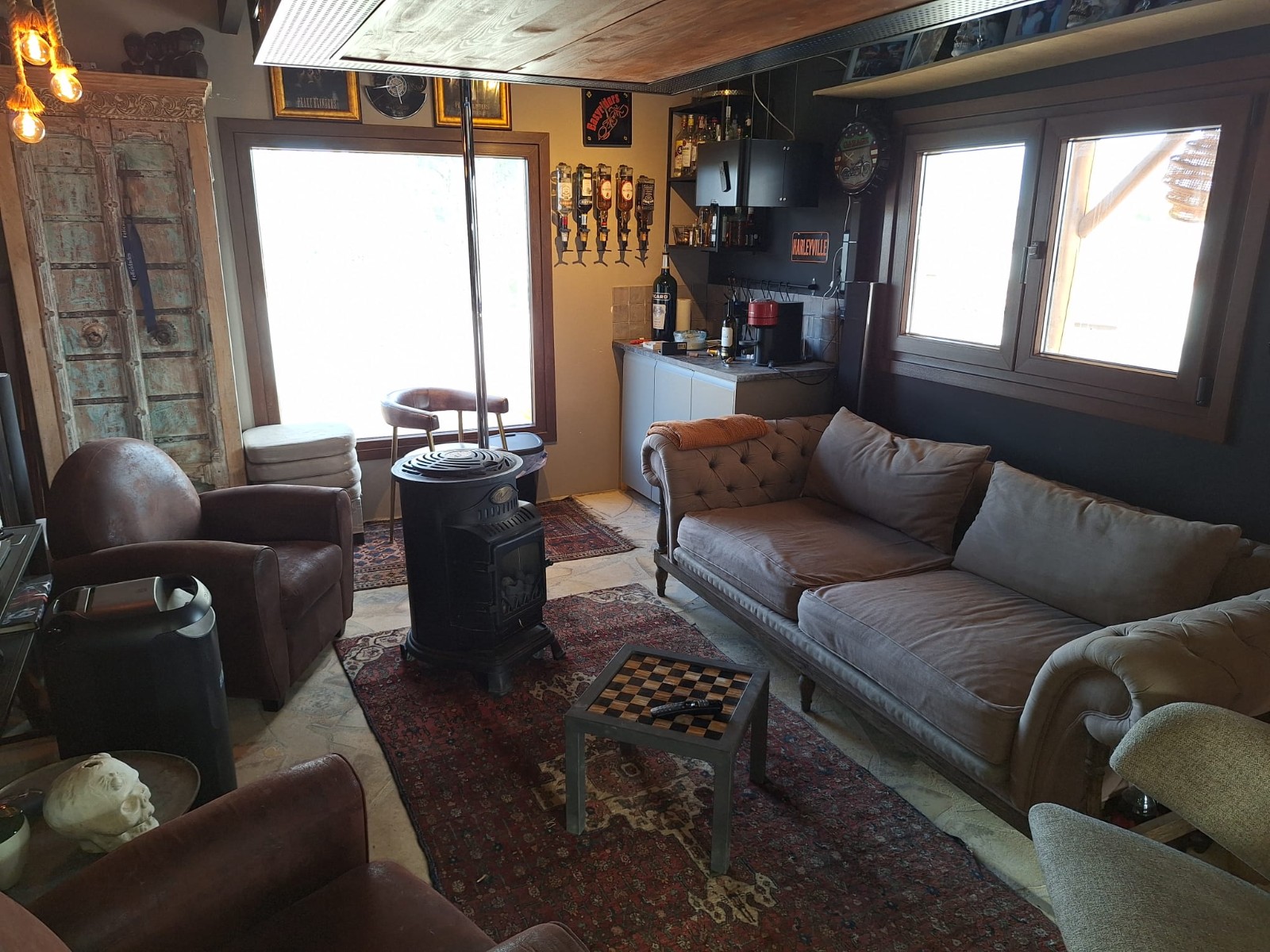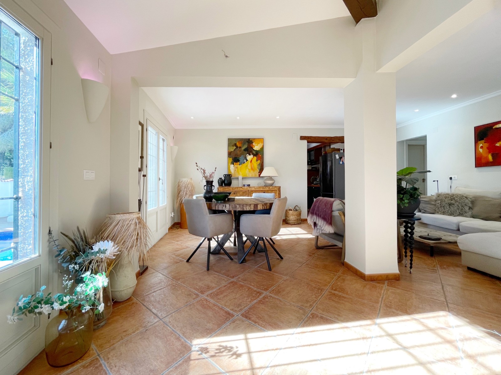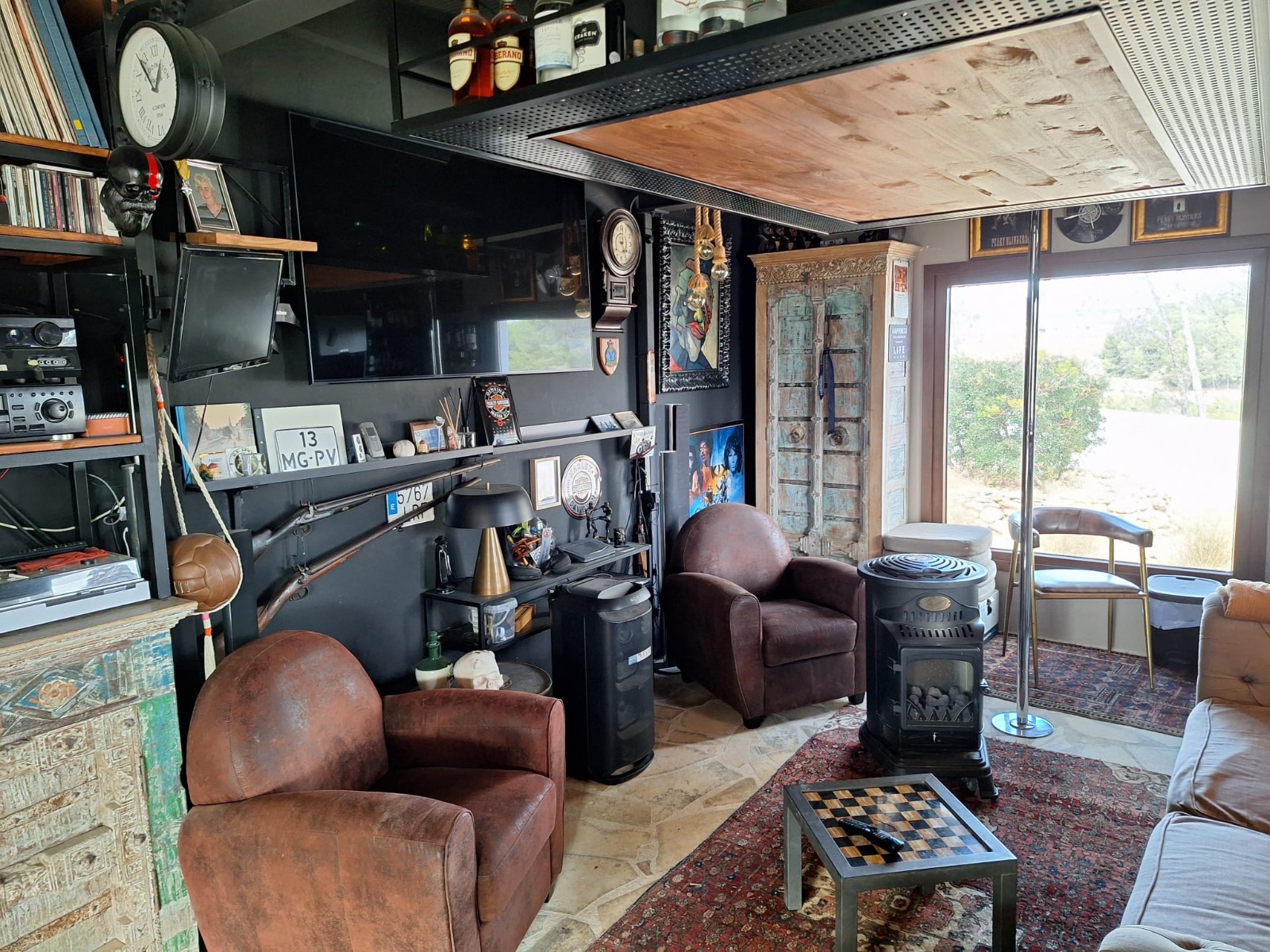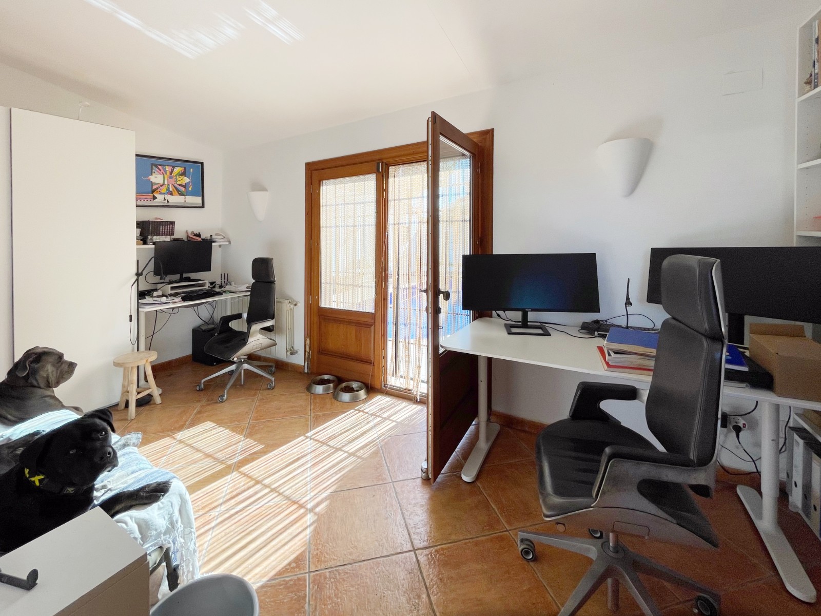 Naast de hoofdingang met een voetgangersdeur kan men ook via de achterzijde het perceel betreden via een grote houten poort of via de automatische poort. Hier vinden we ook 2 garages, waarvan er 1 momenteel in gebruik is als opslagruimte en de ander is omgevormd tot een echte “man cave”, die natuurlijk ook als b.v. extra slaapkamer of gym e.d. zou kunnen dienen . De woning zelf beschikt over een ruime gezellige woonkamer met veel lichtinval via de openslaande deuren, 2 slaapkamers (beide voorzien van airco) en 2 badkamers, waarvan 1 en suite. De keuken is verbonden met een iets lager gelegen kamer, momenteel in gebruik als kantoor (maar kan ook omgevormd worden tot een extra slaapkamer) en biedt tevens toegang tot een bijkeuken. Grenzend aan de woonkamer ook weer een leuk terras voorzien van een lange statafel onder een pergola en een praktische buitenkeuken. Ook het 8 x 4 M. grootte zwembad is omringd door een ruim terras met o.a. een gezellige loungehoek.