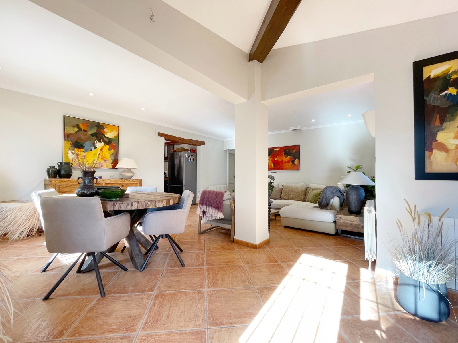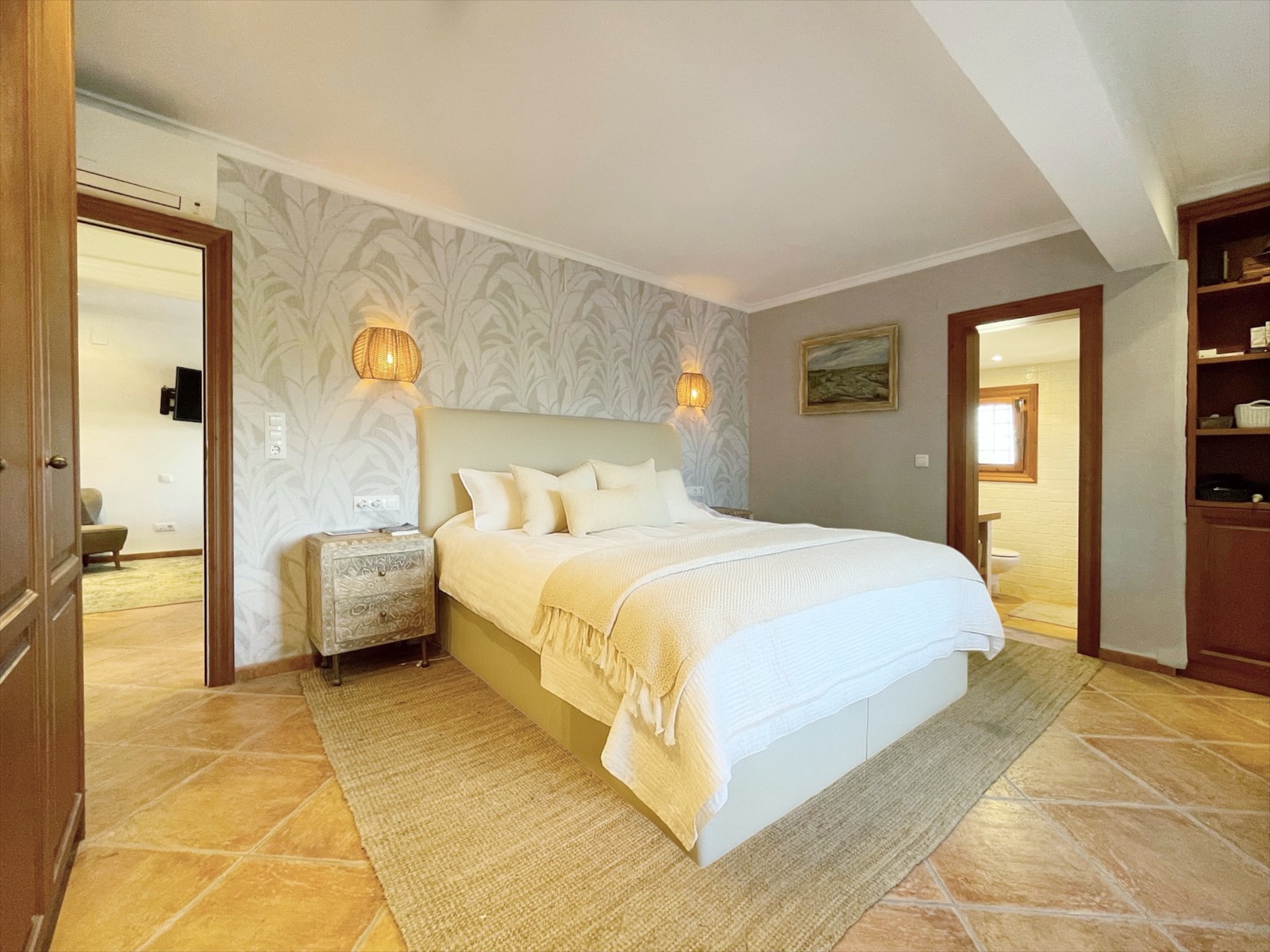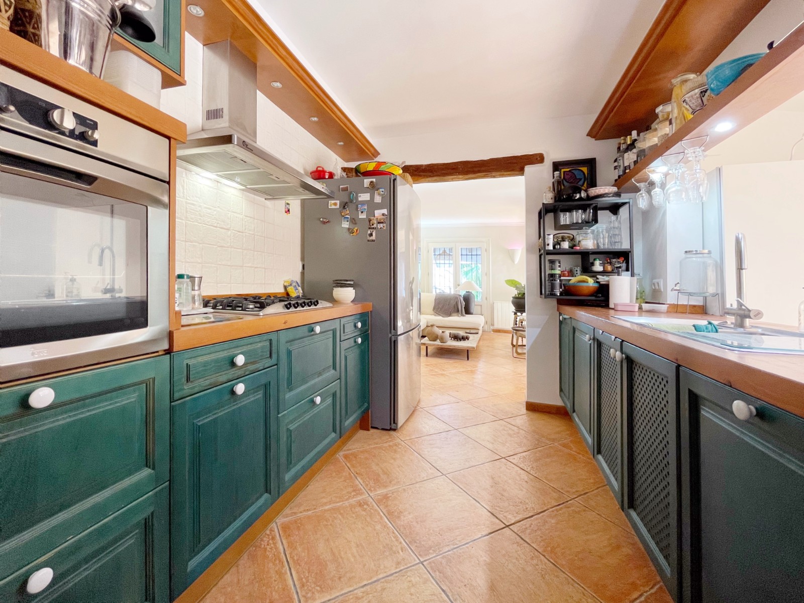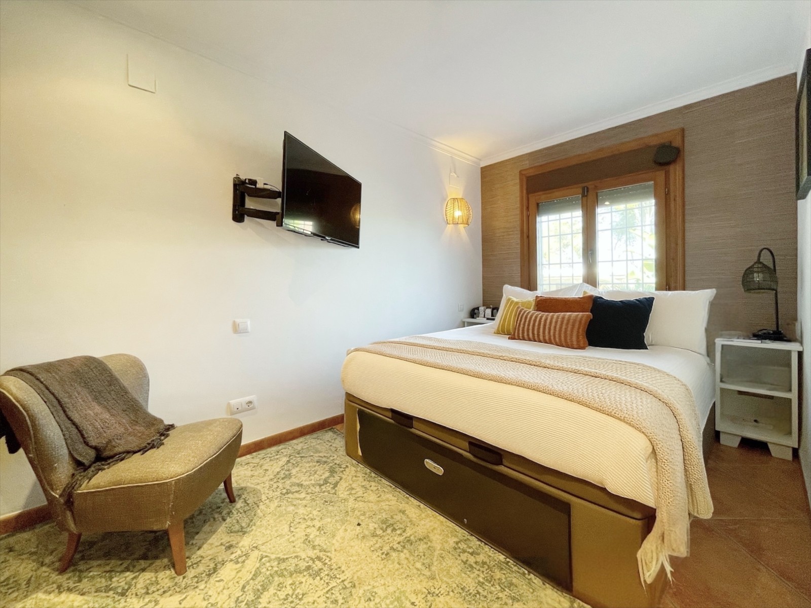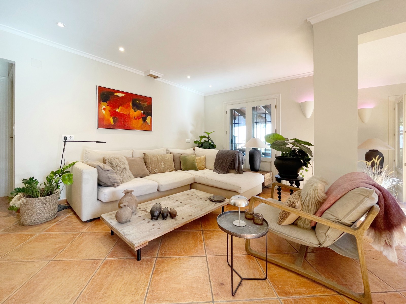 Naast de hoofdingang met een voetgangersdeur kan men ook via de achterzijde het perceel betreden via een grote houten poort of via de automatische poort. Hier vinden we ook 2 garages, waarvan er 1 momenteel in gebruik is als opslagruimte en de ander is omgevormd tot een echte “man cave”, die natuurlijk ook als b.v. extra slaapkamer of gym e.d. zou kunnen dienen . De woning zelf beschikt over een ruime gezellige woonkamer met veel lichtinval via de openslaande deuren, 2 slaapkamers (beide voorzien van airco) en 2 badkamers, waarvan 1 en suite. De keuken is verbonden met een iets lager gelegen kamer, momenteel in gebruik als kantoor (maar kan ook omgevormd worden tot een extra slaapkamer) en biedt tevens toegang tot een bijkeuken. Grenzend aan de woonkamer ook weer een leuk terras voorzien van een lange statafel onder een pergola en een praktische buitenkeuken. Ook het 8 x 4 M. grootte zwembad is omringd door een ruim terras met o.a. een gezellige loungehoek.