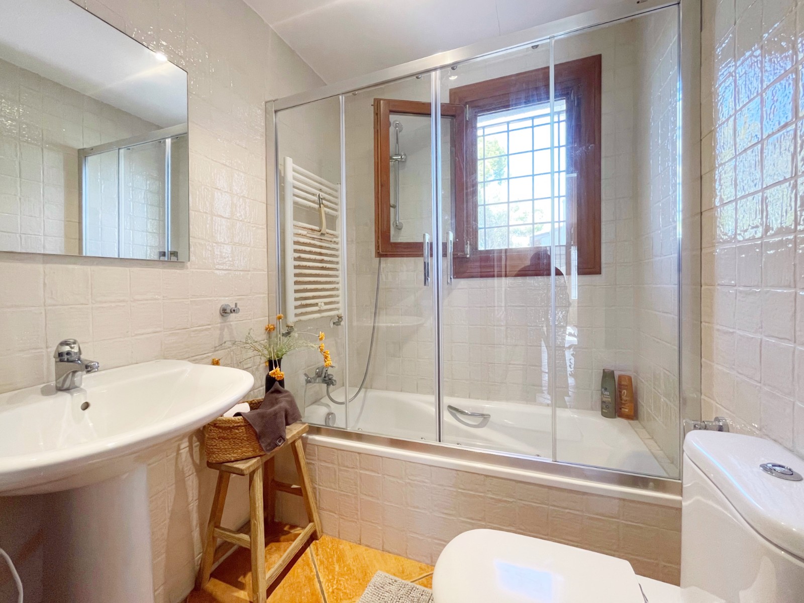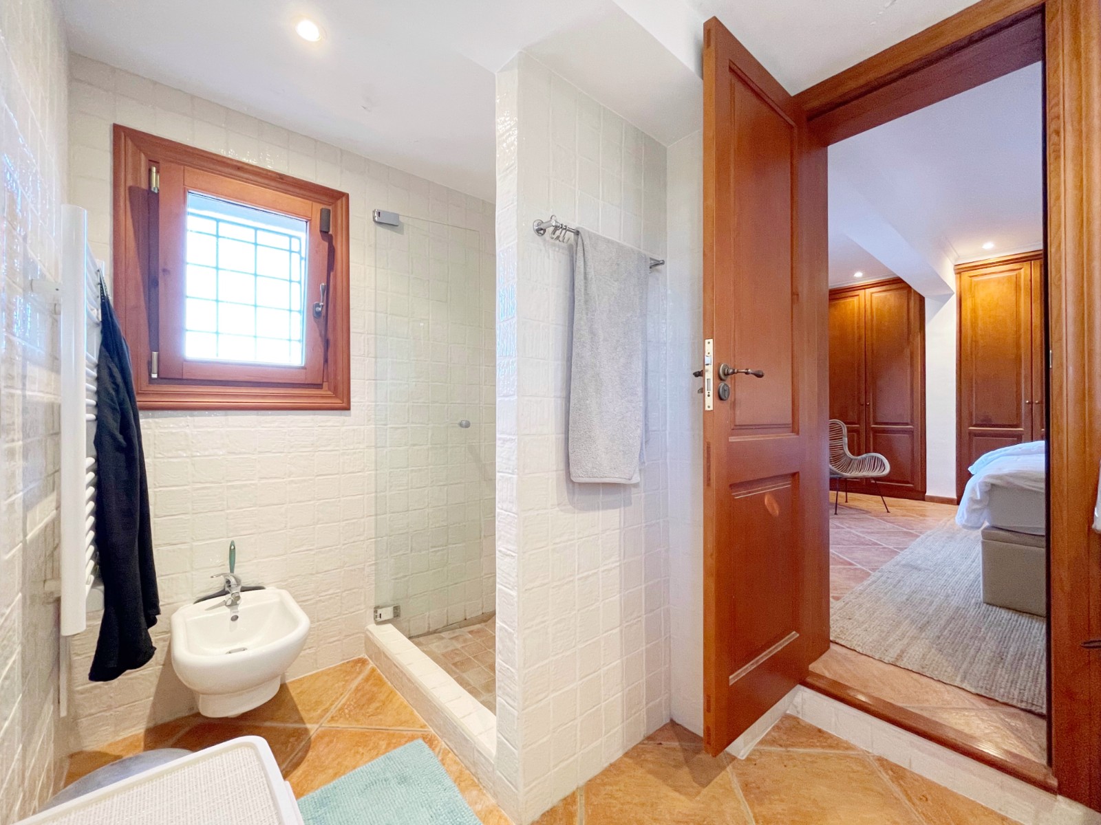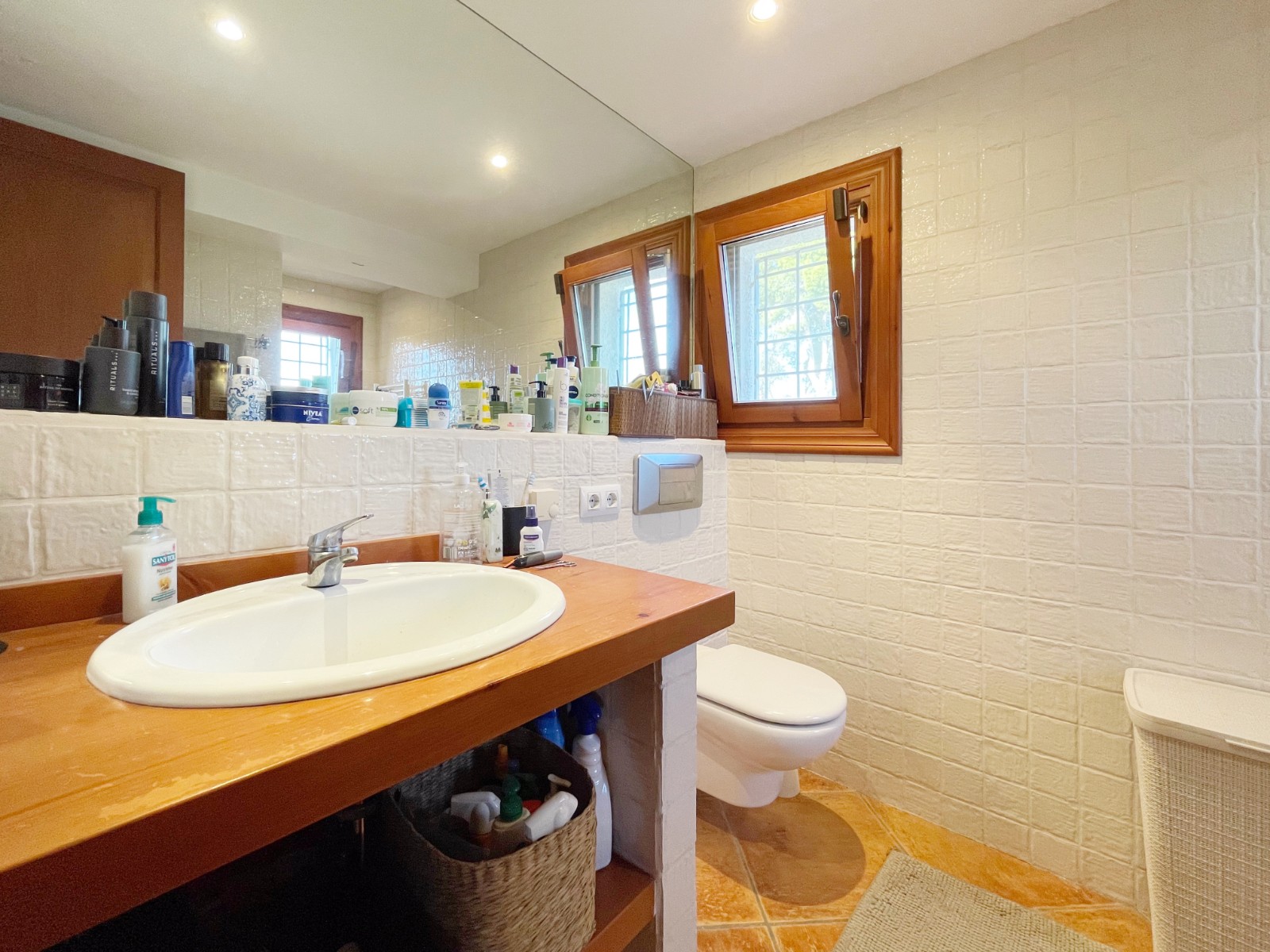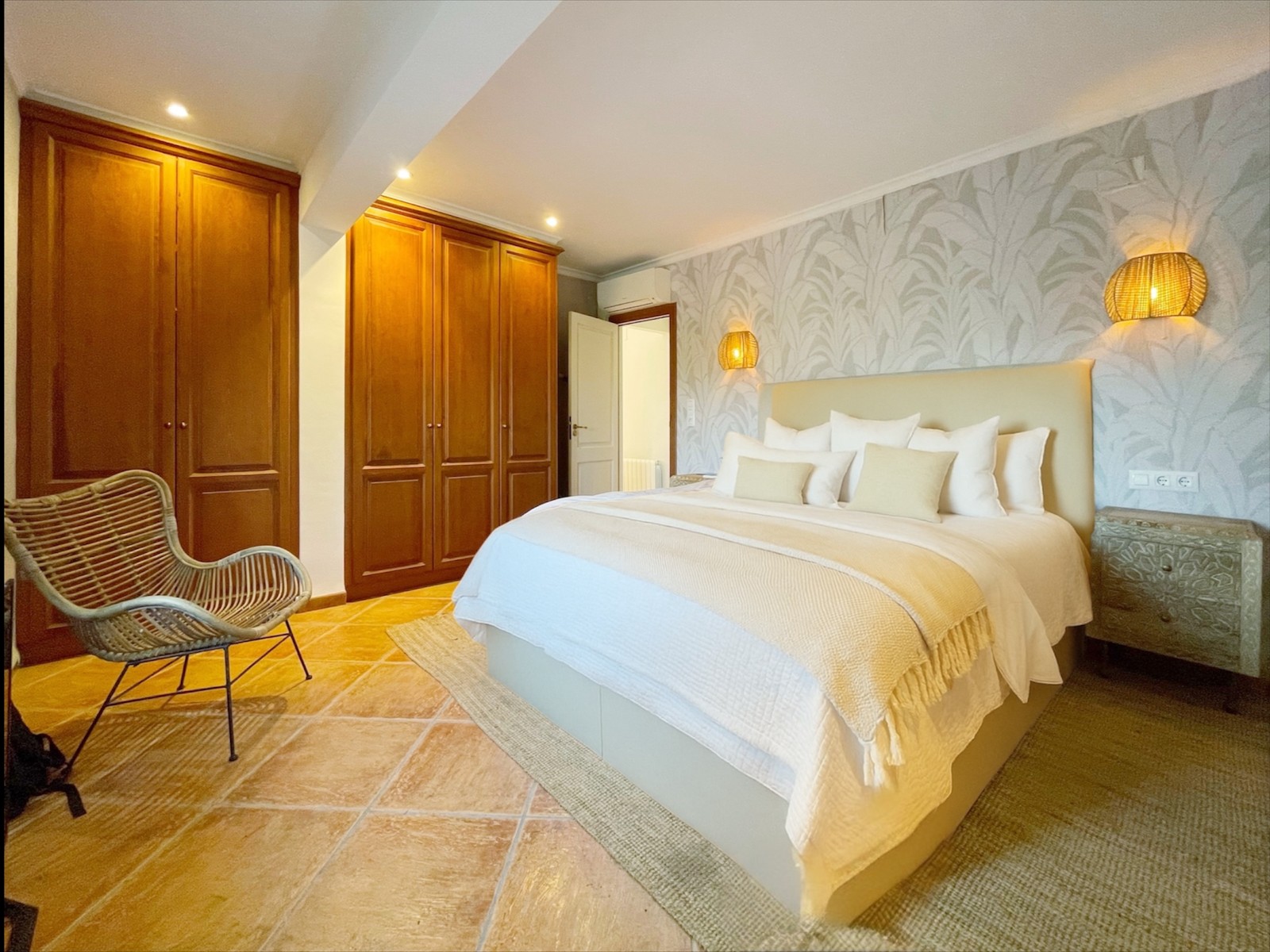 Naast de hoofdingang met een voetgangersdeur kan men ook via de achterzijde het perceel betreden via een grote houten poort of via de automatische poort. Hier vinden we ook 2 garages, waarvan er 1 momenteel in gebruik is als opslagruimte en de ander is omgevormd tot een echte “man cave”, die natuurlijk ook als b.v. extra slaapkamer of gym e.d. zou kunnen dienen . De woning zelf beschikt over een ruime gezellige woonkamer met veel lichtinval via de openslaande deuren, 2 slaapkamers (beide voorzien van airco) en 2 badkamers, waarvan 1 en suite. De keuken is verbonden met een iets lager gelegen kamer, momenteel in gebruik als kantoor (maar kan ook omgevormd worden tot een extra slaapkamer) en biedt tevens toegang tot een bijkeuken. Grenzend aan de woonkamer ook weer een leuk terras voorzien van een lange statafel onder een pergola en een praktische buitenkeuken. Ook het 8 x 4 M. grootte zwembad is omringd door een ruim terras met o.a. een gezellige loungehoek.